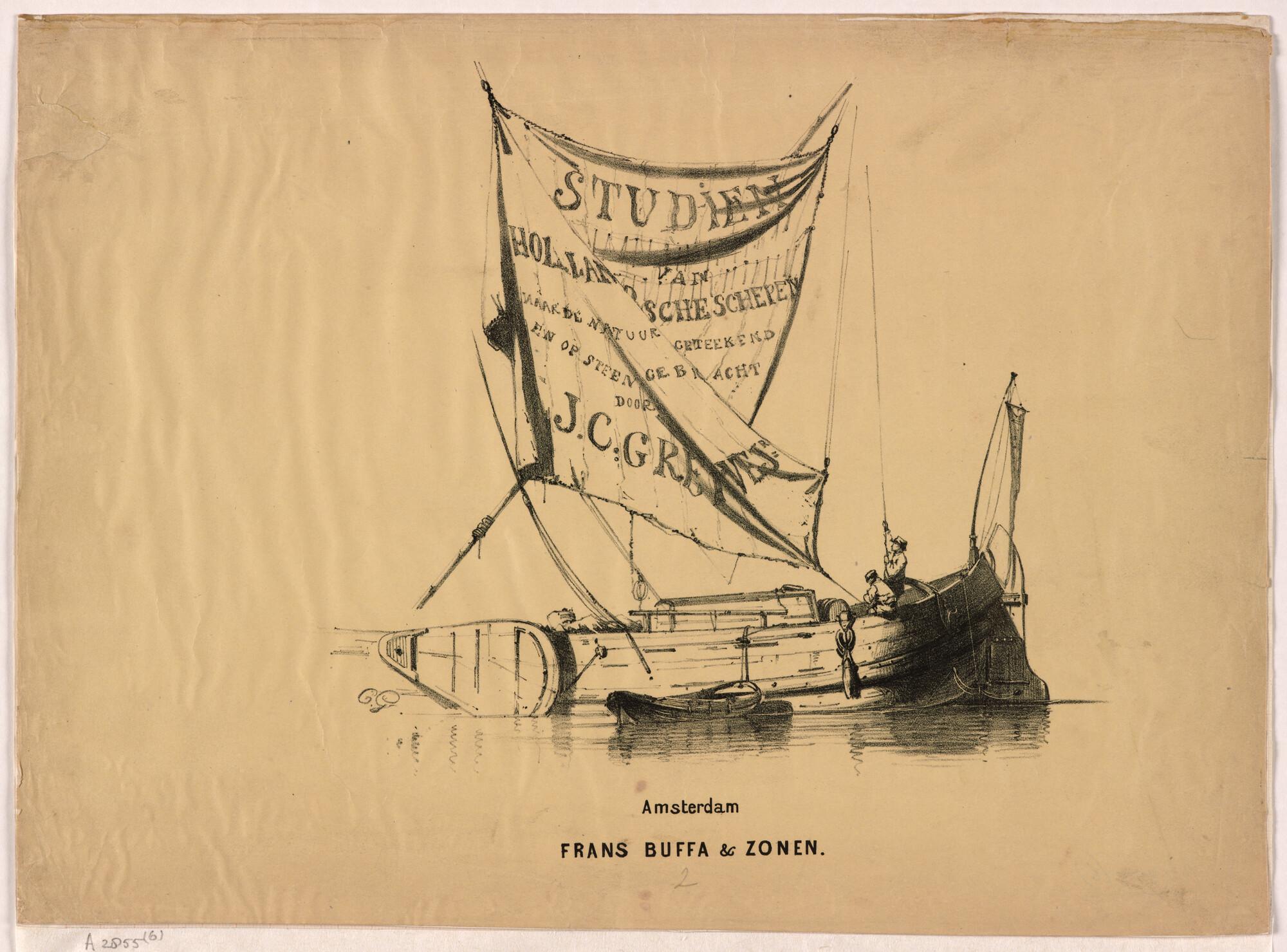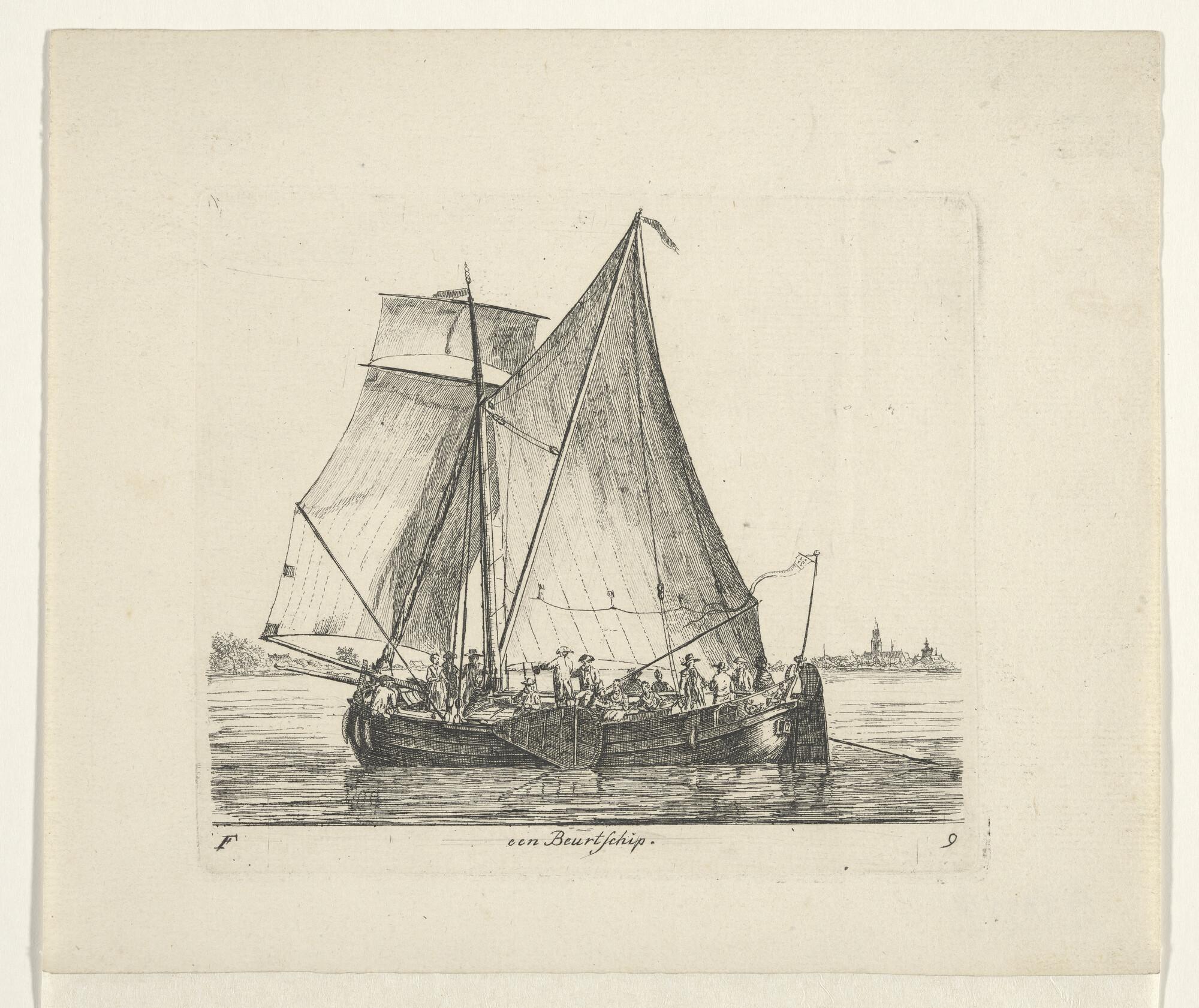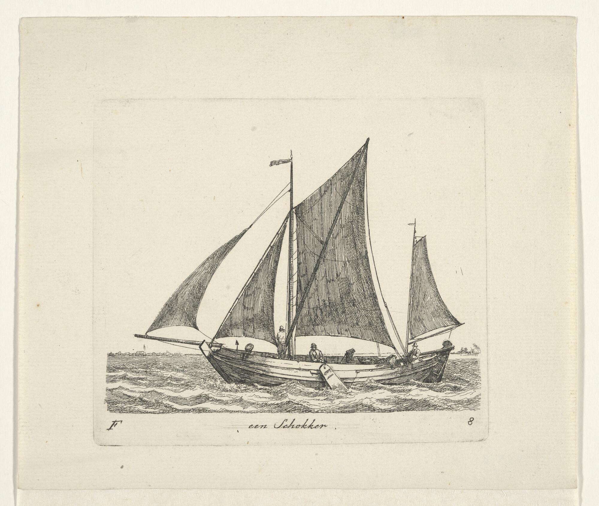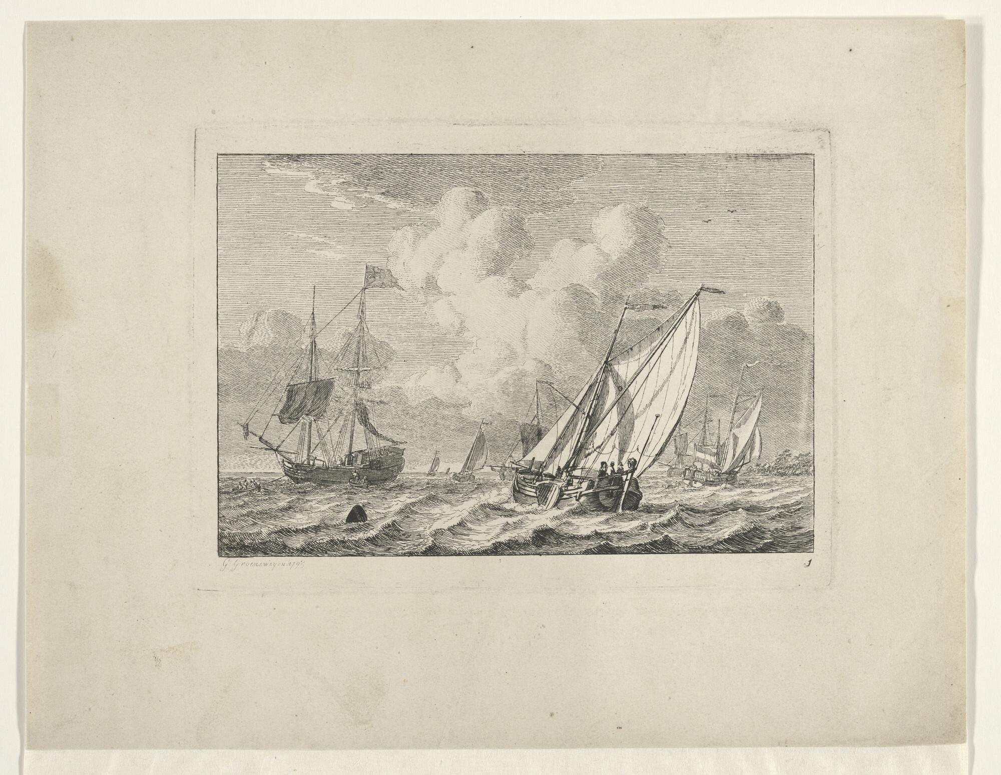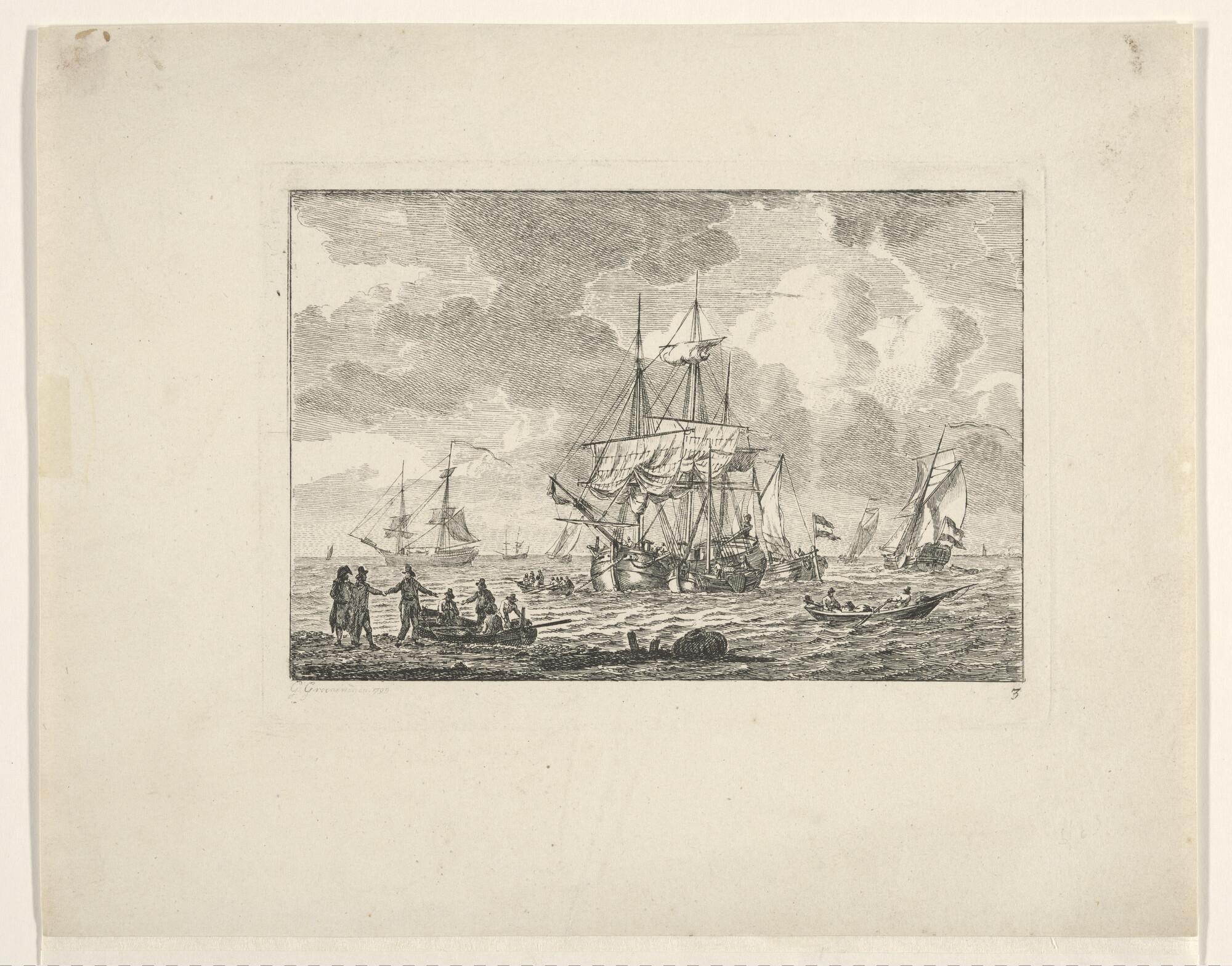 Prent van scheepvaart op de Nieuwe Maas voor Rotterdam