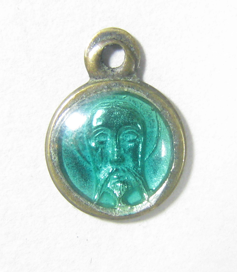 Groen bedevaarthangertje met het gelaat van Christus...