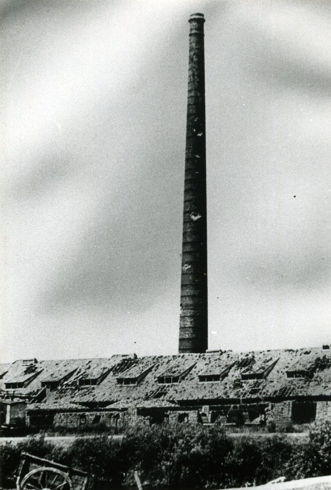 Zwart-wit foto van de oorlogsschade aan de steenfabr...