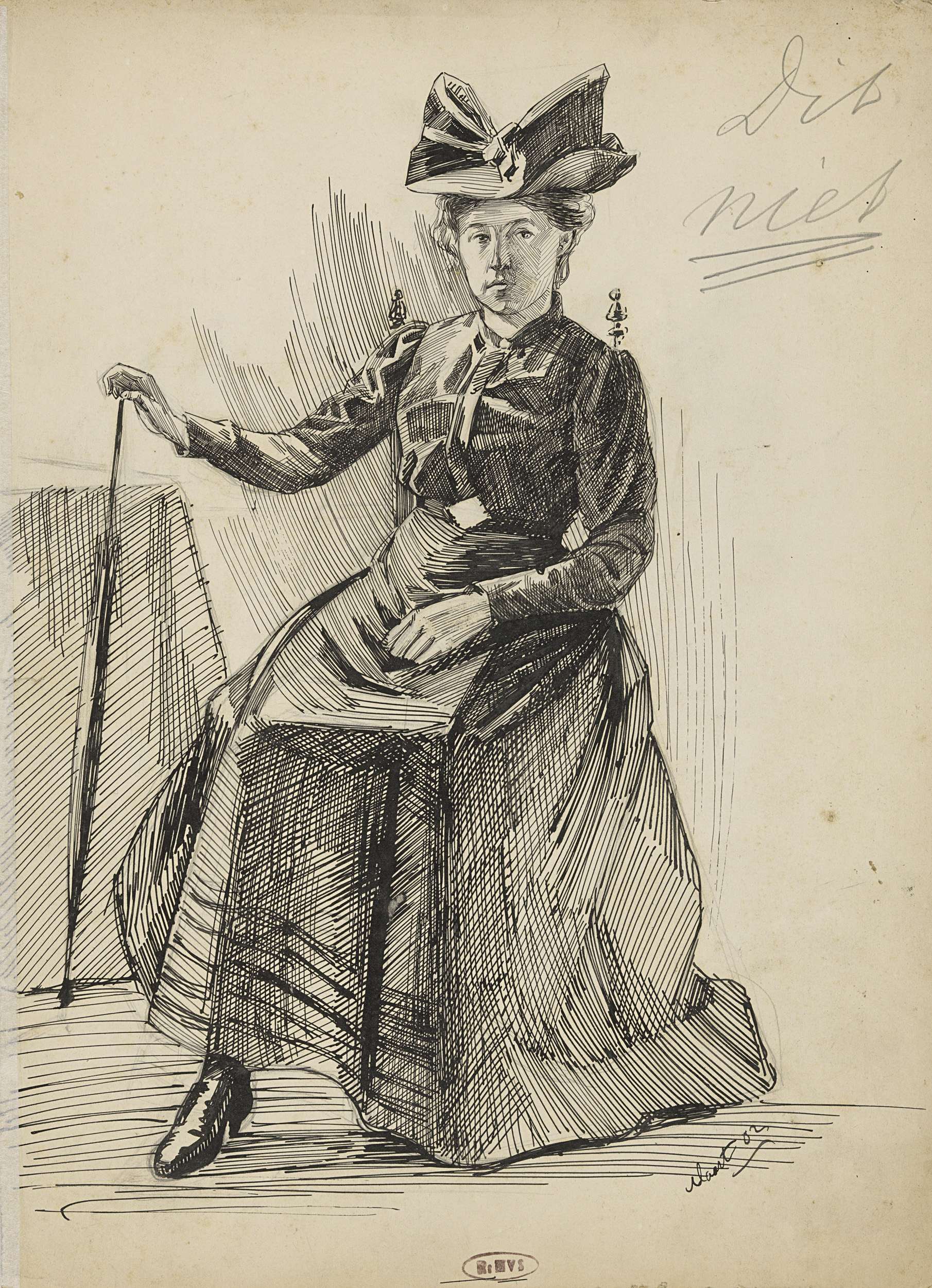 Portret van een zittende vrouw met wandelstok