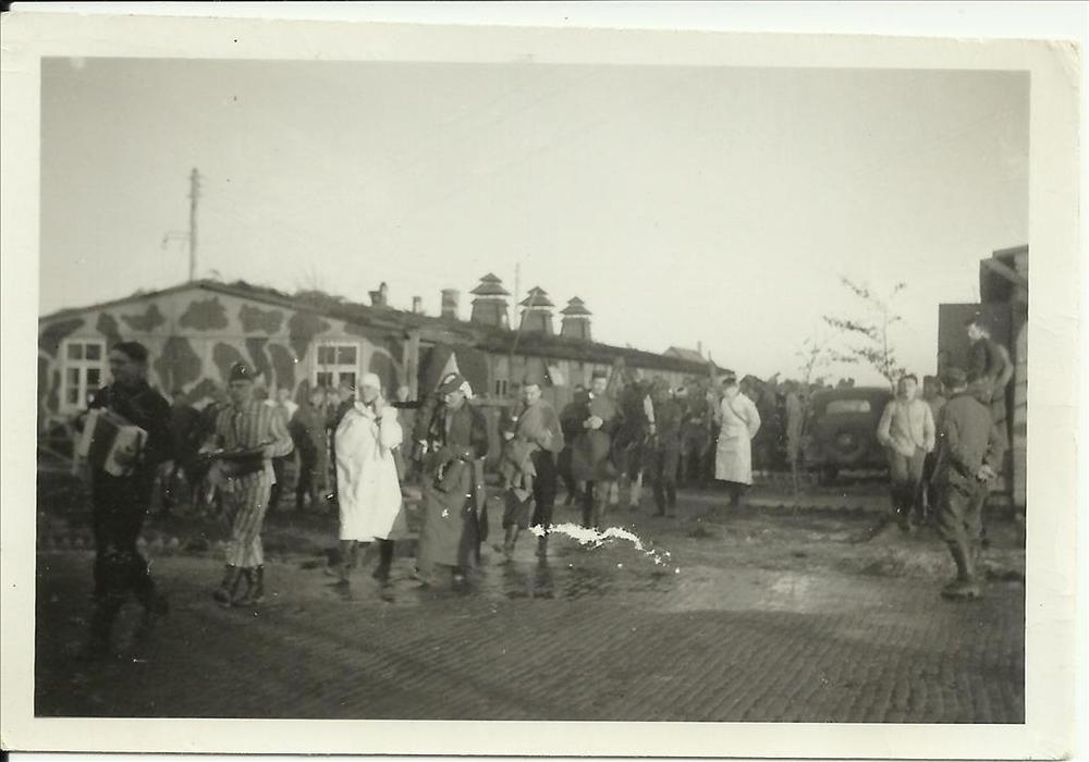 colonne Duitse krijgsgevangenen bij café-restaurant
