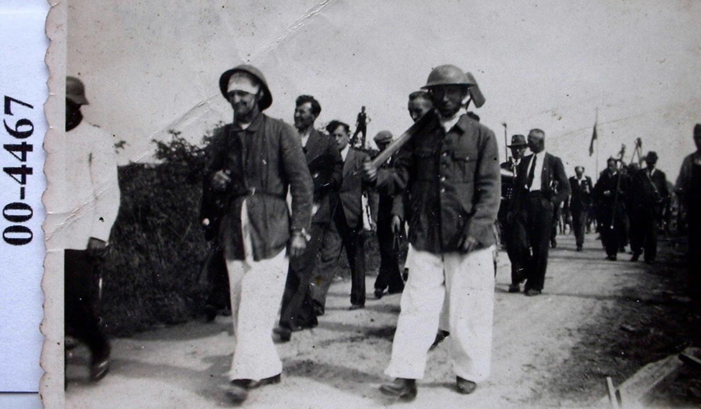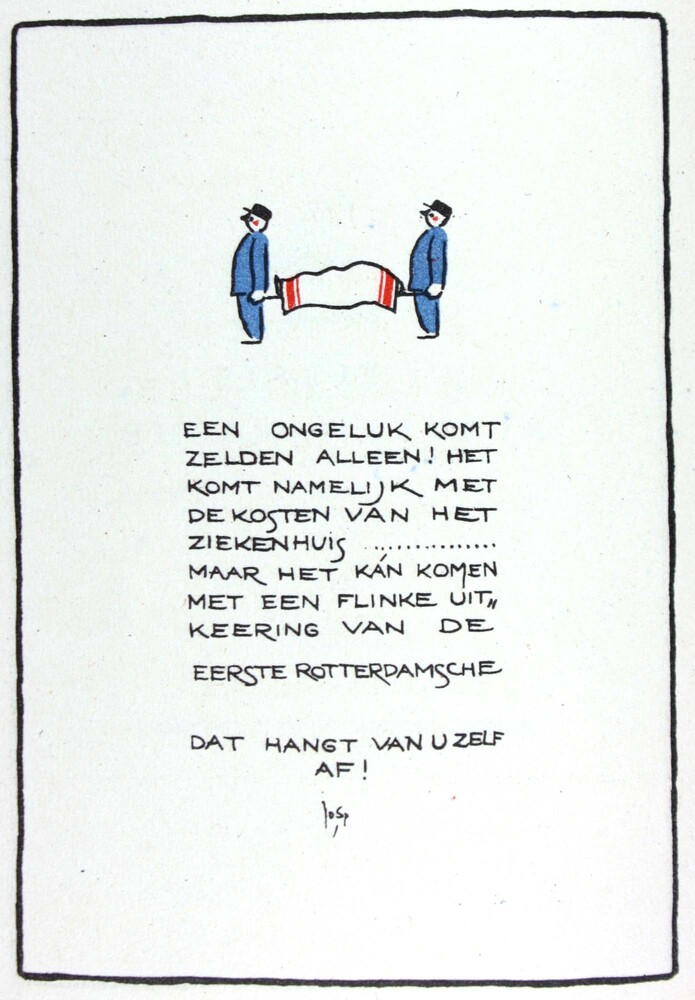 Illustratie door Jo Spier van twee mannen met draagb...