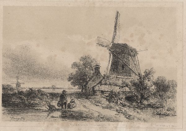 Landschap met molen aan een weg