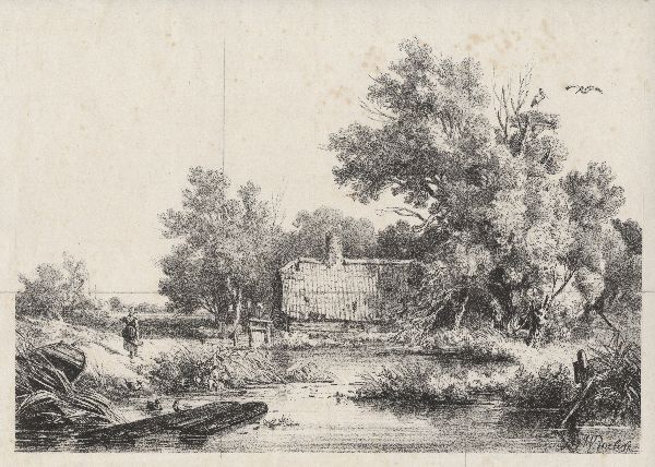 Landschap met plas en boerderij