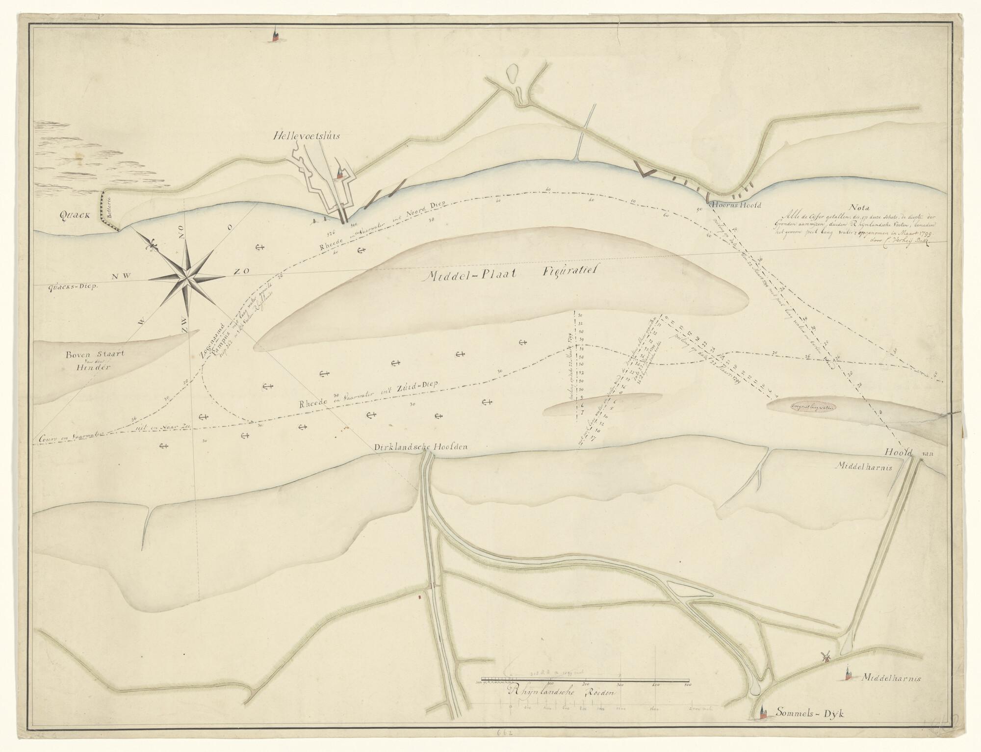 Gekleurde handschriftkaart van het Noorddiep en Zuid...