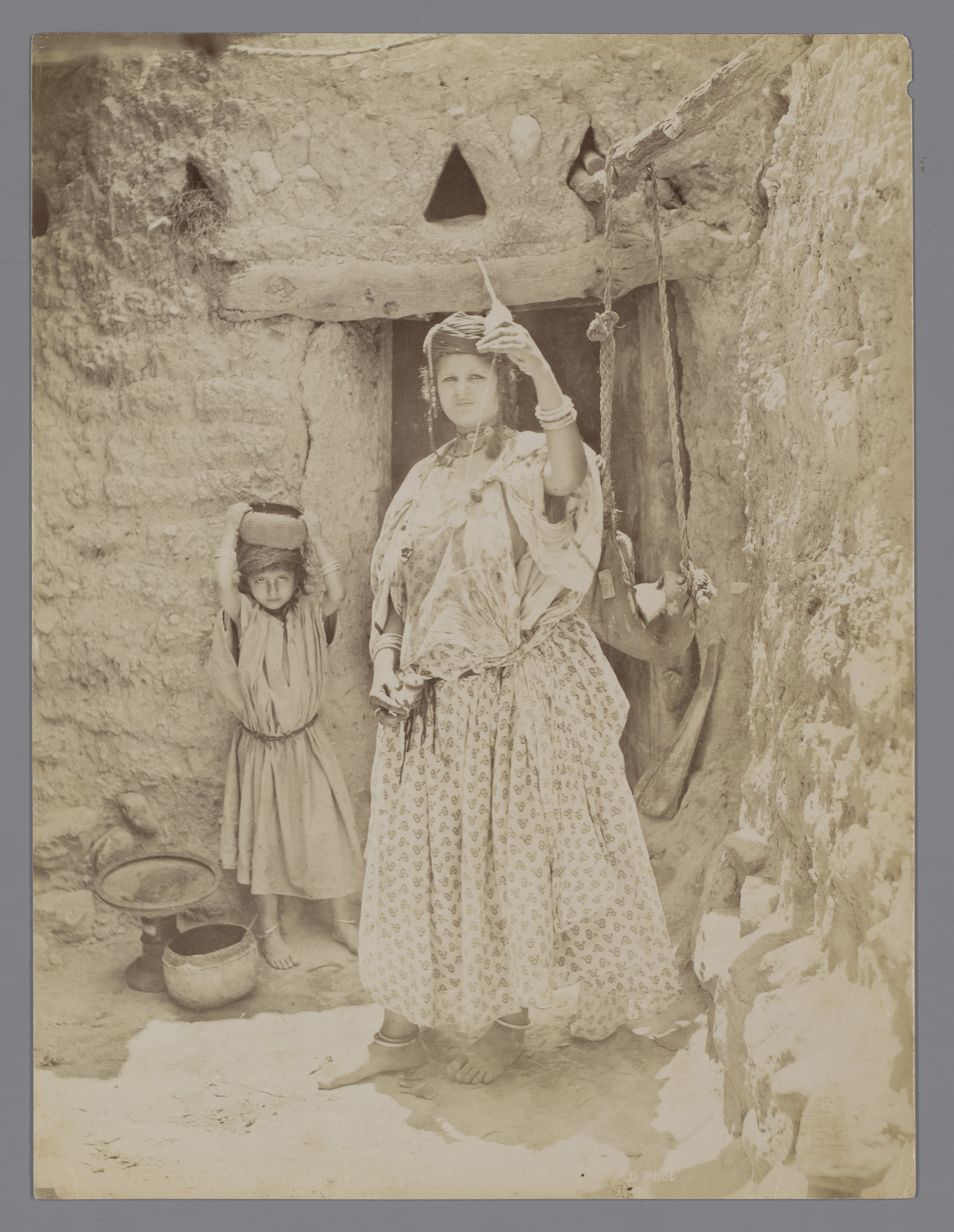 Onbekende vrouw met spintol, achter haar een kind