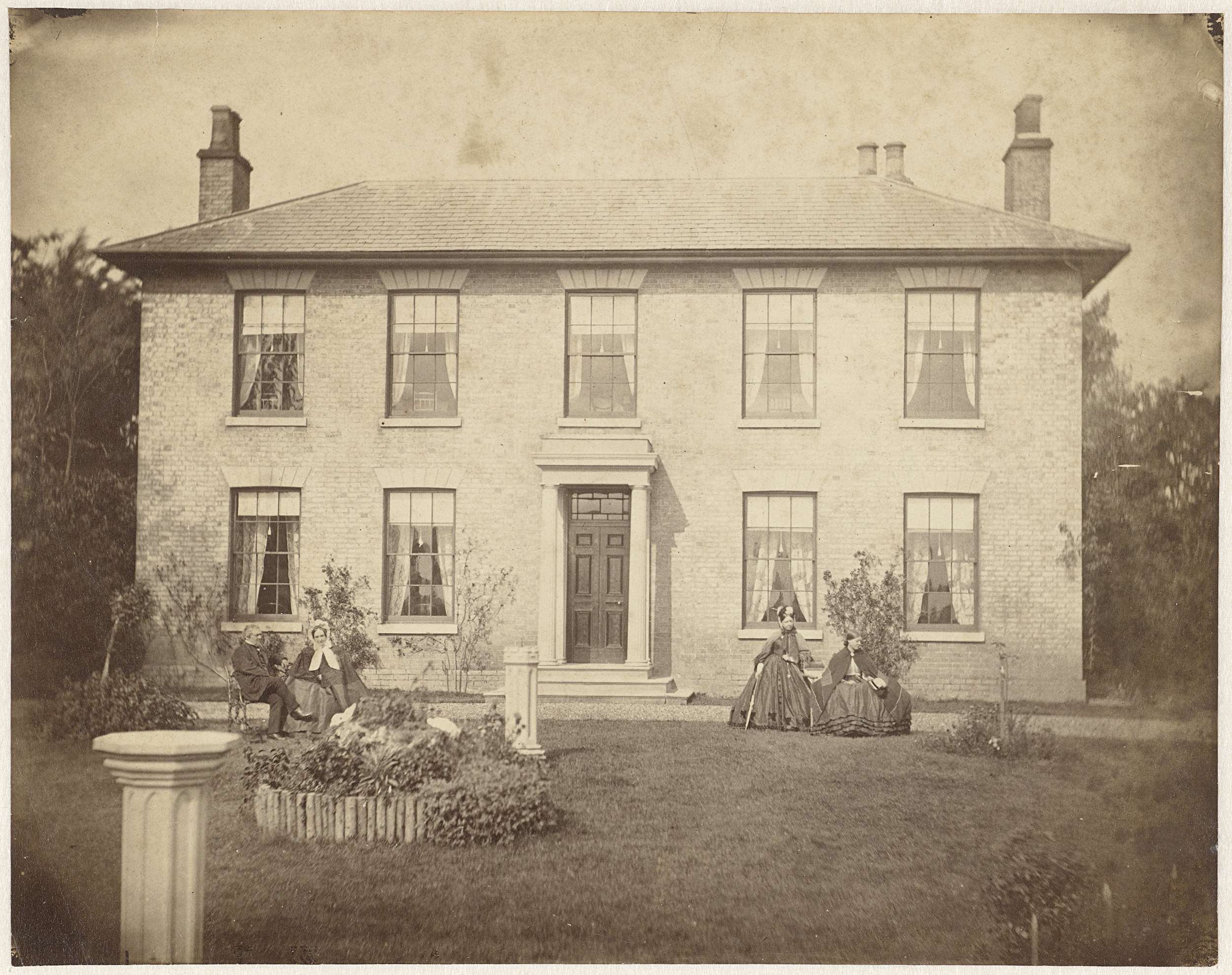 Vier onbekende personen voor een landhuis in Engeland