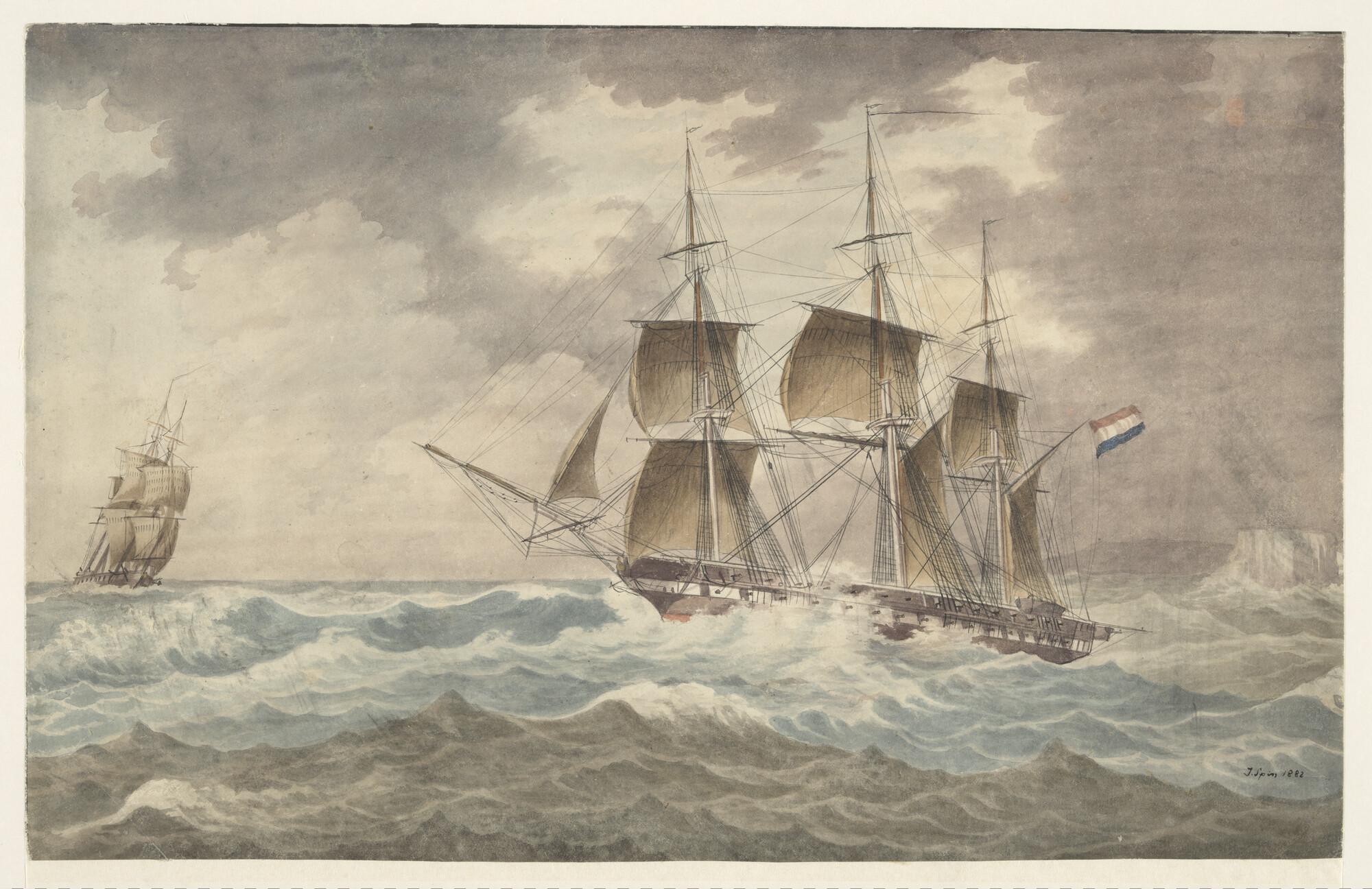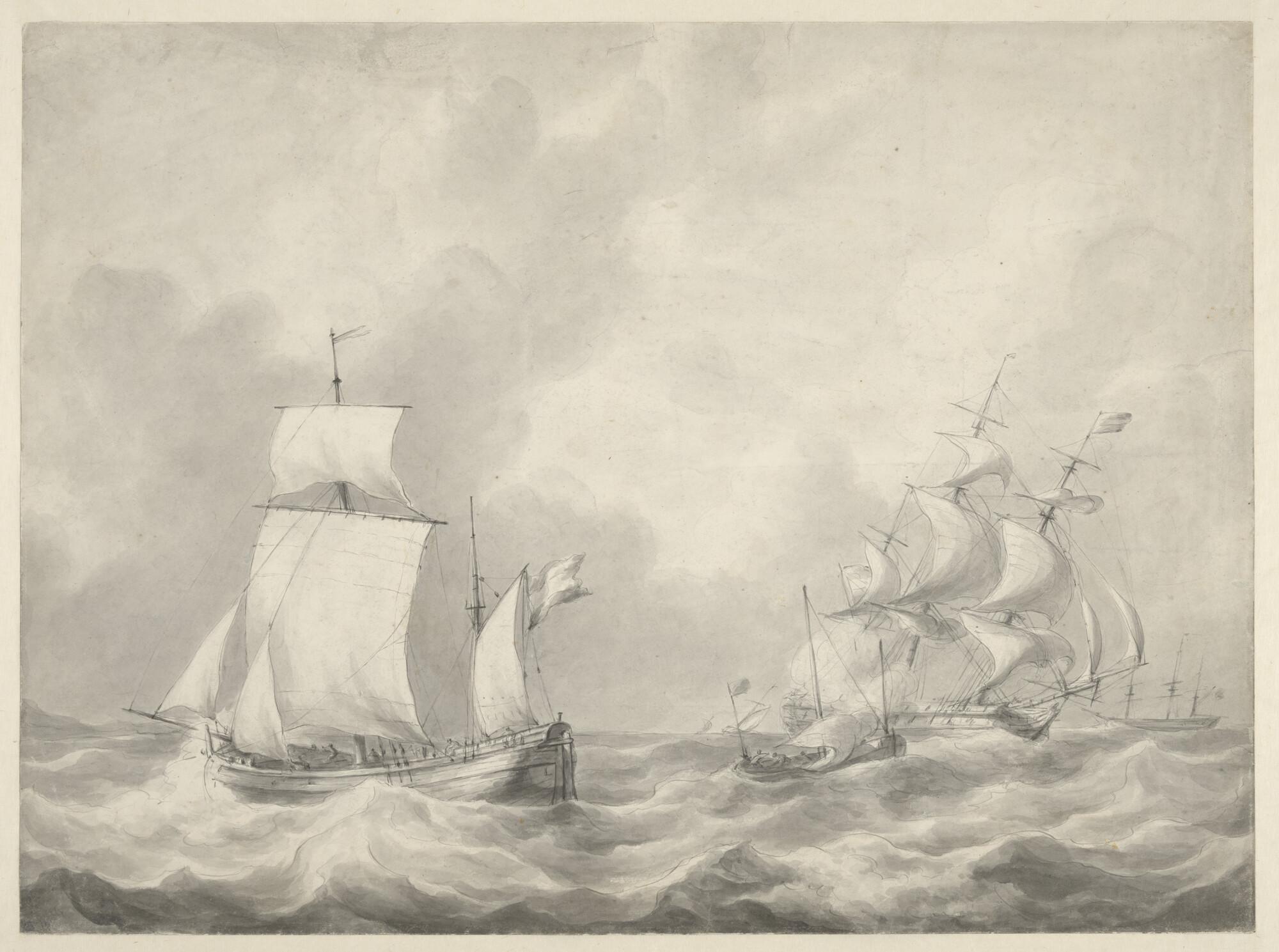Een oorlogskotter en oorlogskorvet onder zeil in ope...