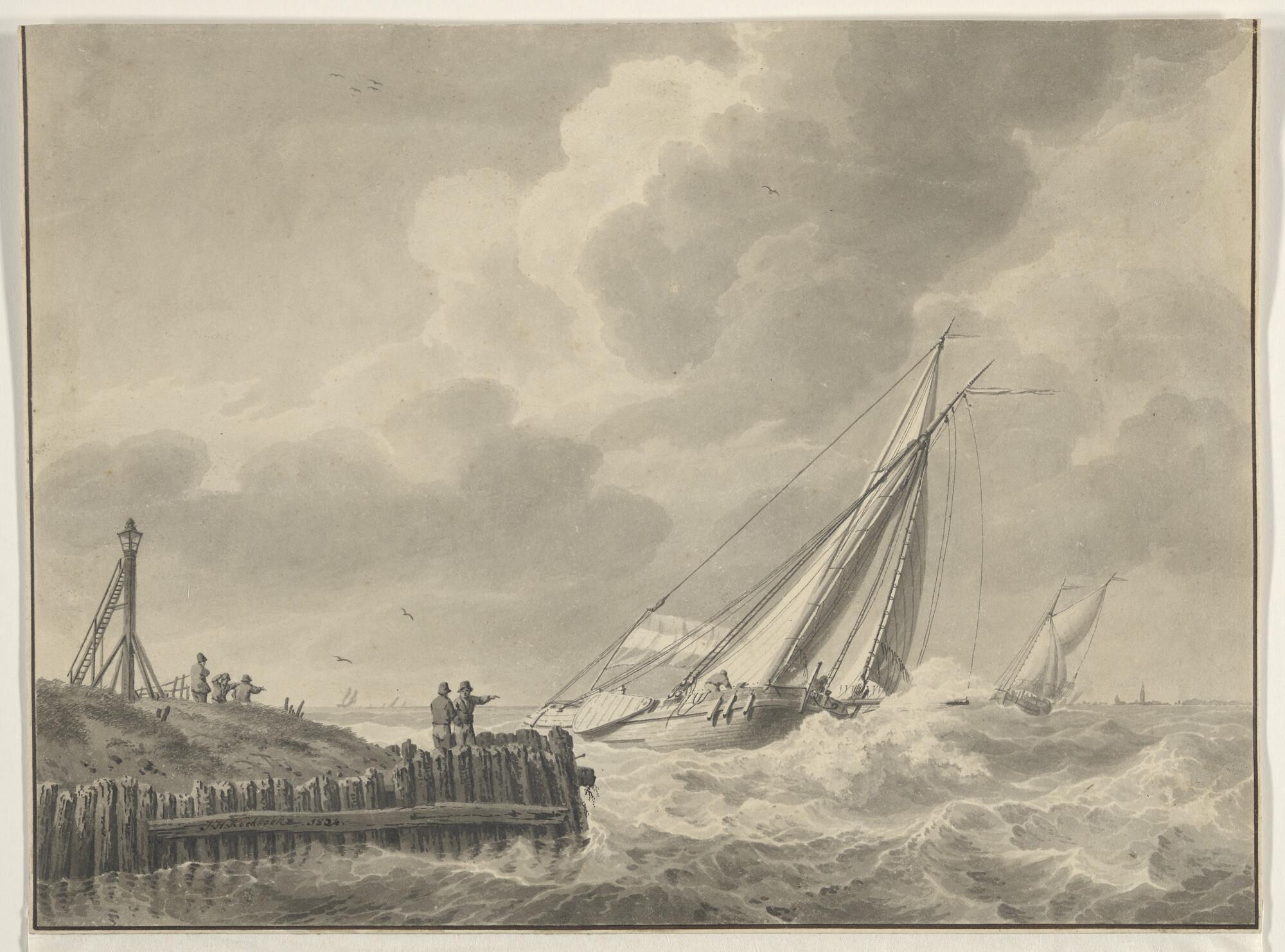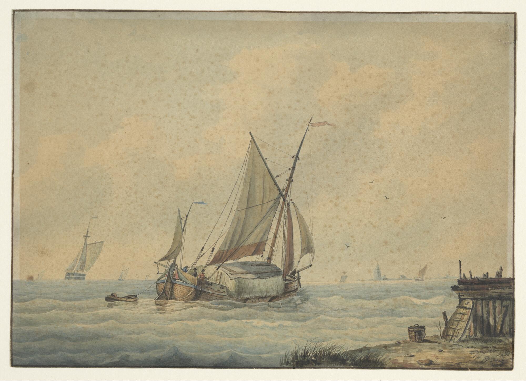 Een tjalk voor anker liggend nabij een havenhoofd