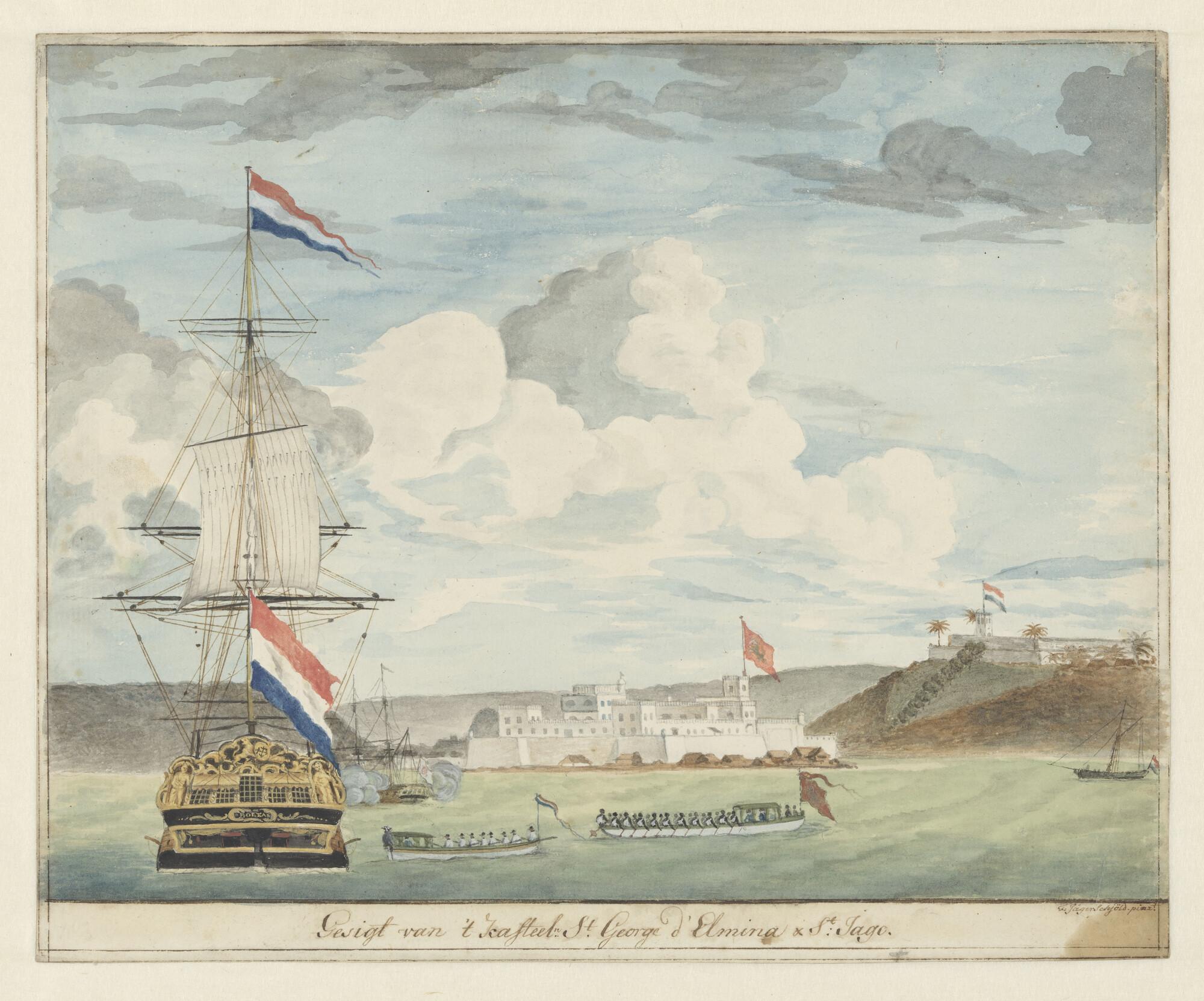 Het fregatschip 'Boreas' op de rede van Elmina