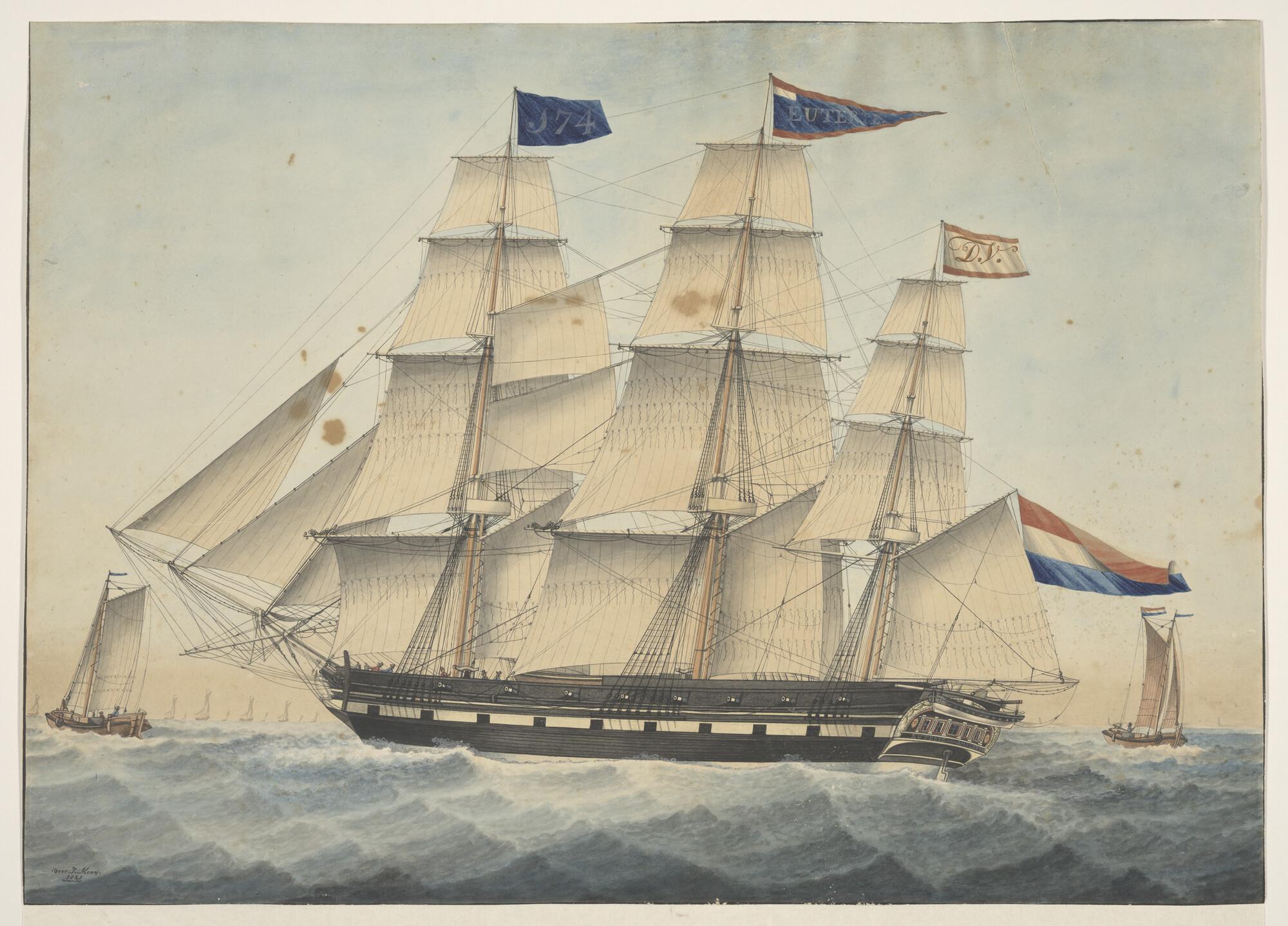 Het fregatschip A.M.E. het zeegat van Texel uitlopend