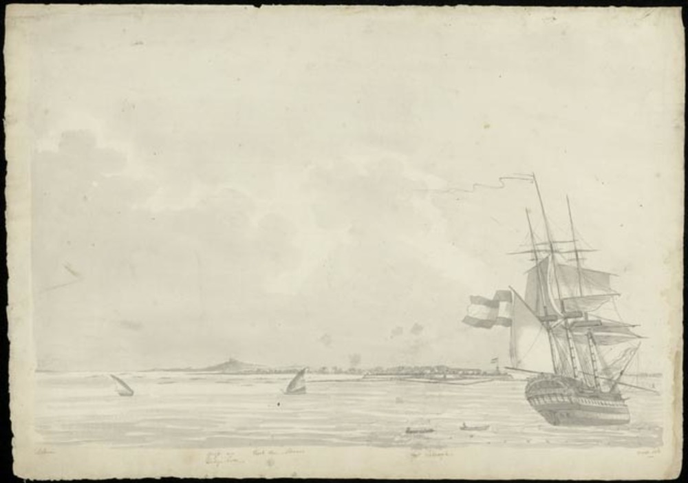 Oost Java - Fregatschip Evertsen voor de kust. 1818