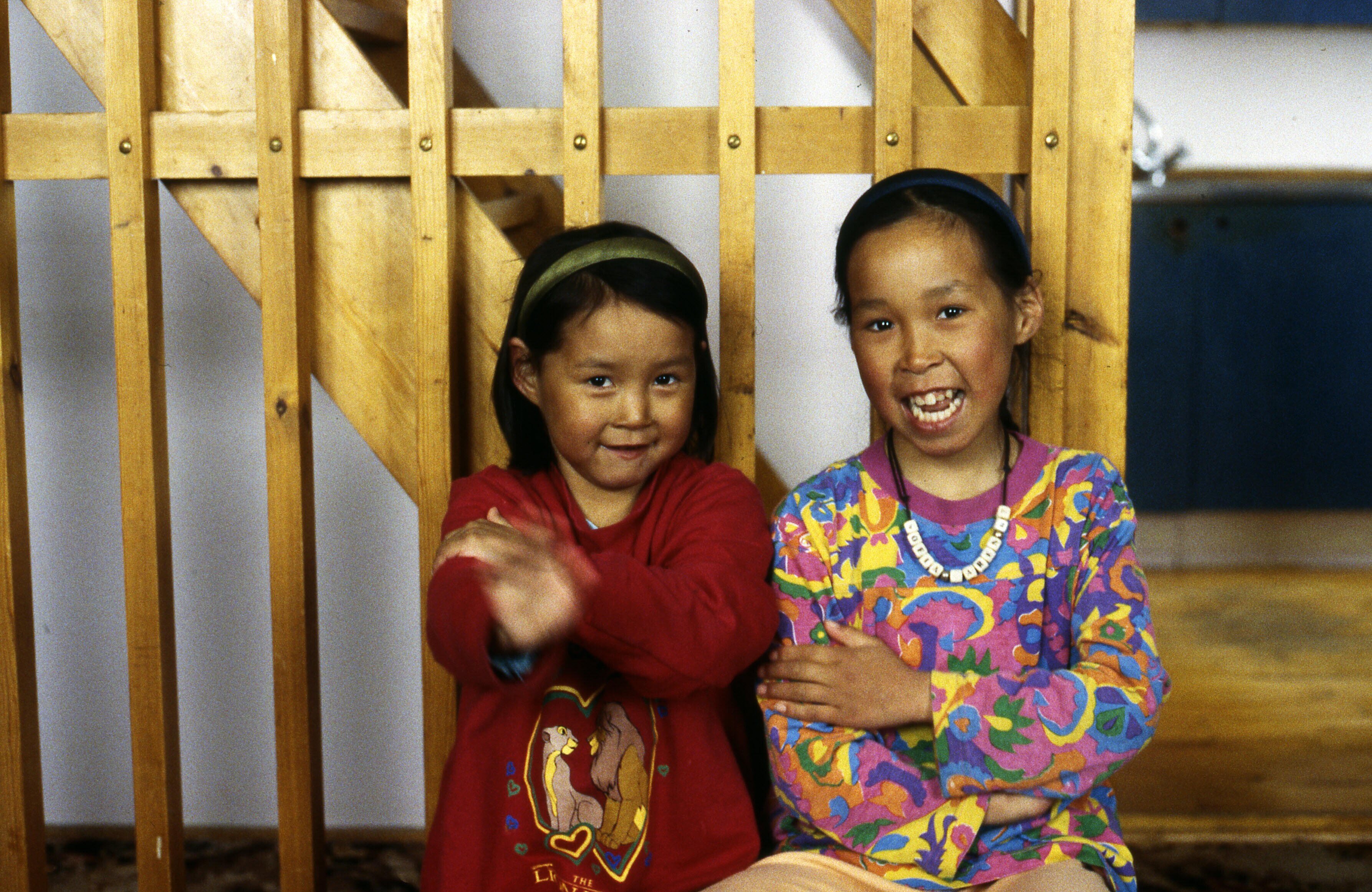 Twee Inuit meisjes in een huis in Tiniteqilaaq, maart .