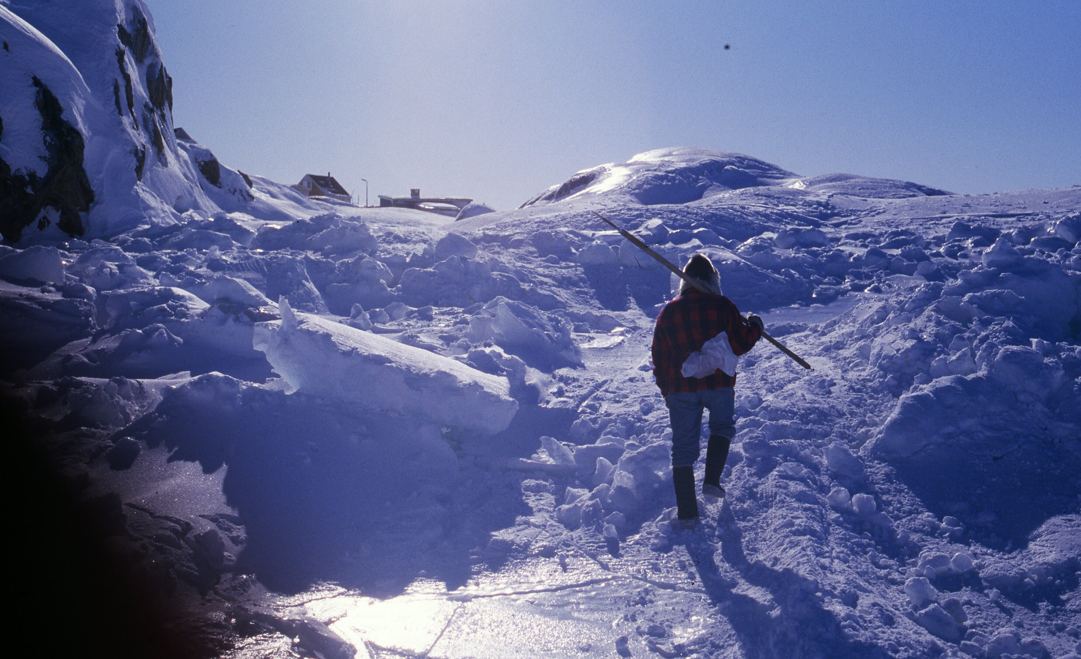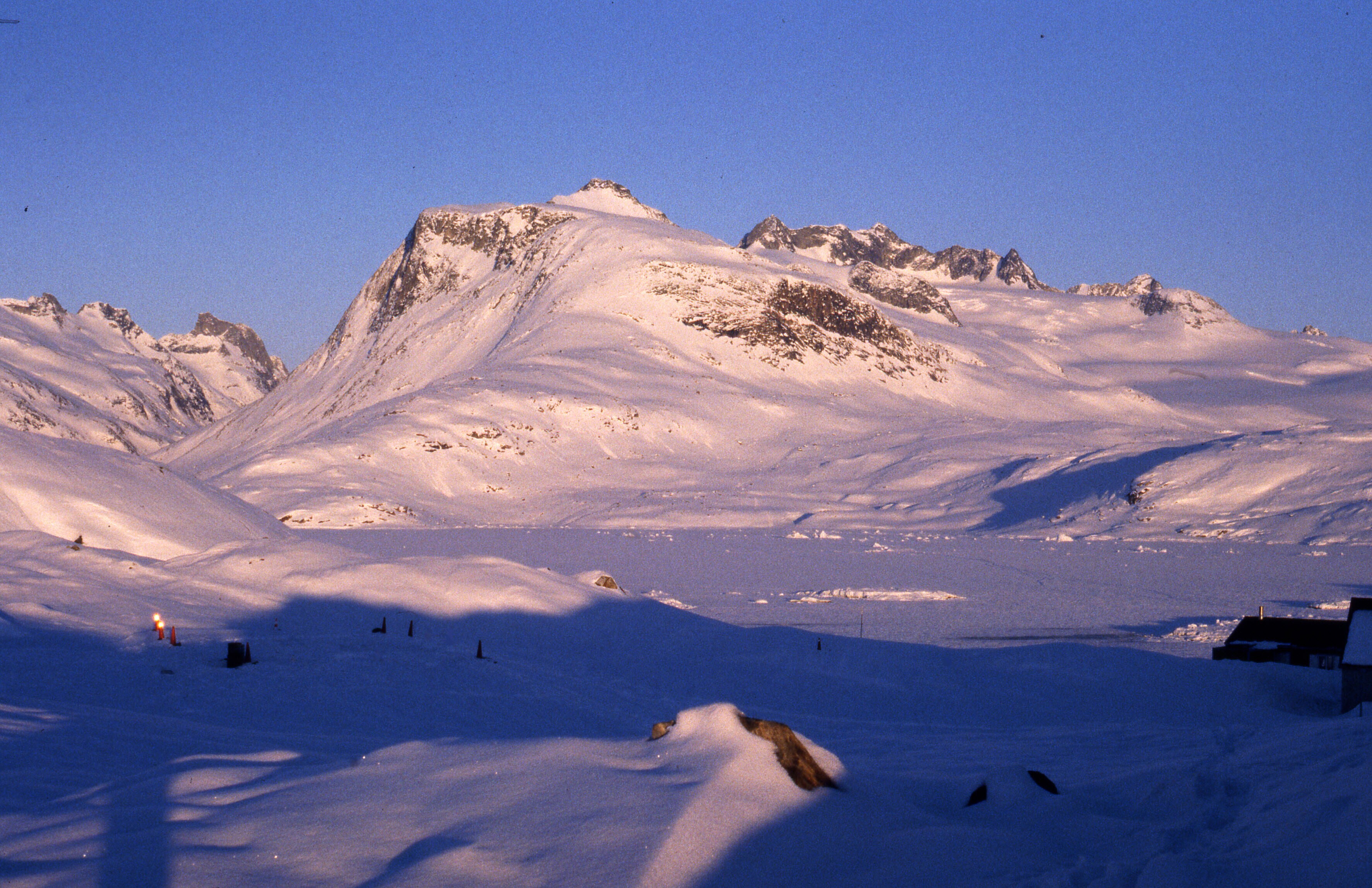 Zicht op Tiniteqilaaq in de sneeuw, sleesporen in de...