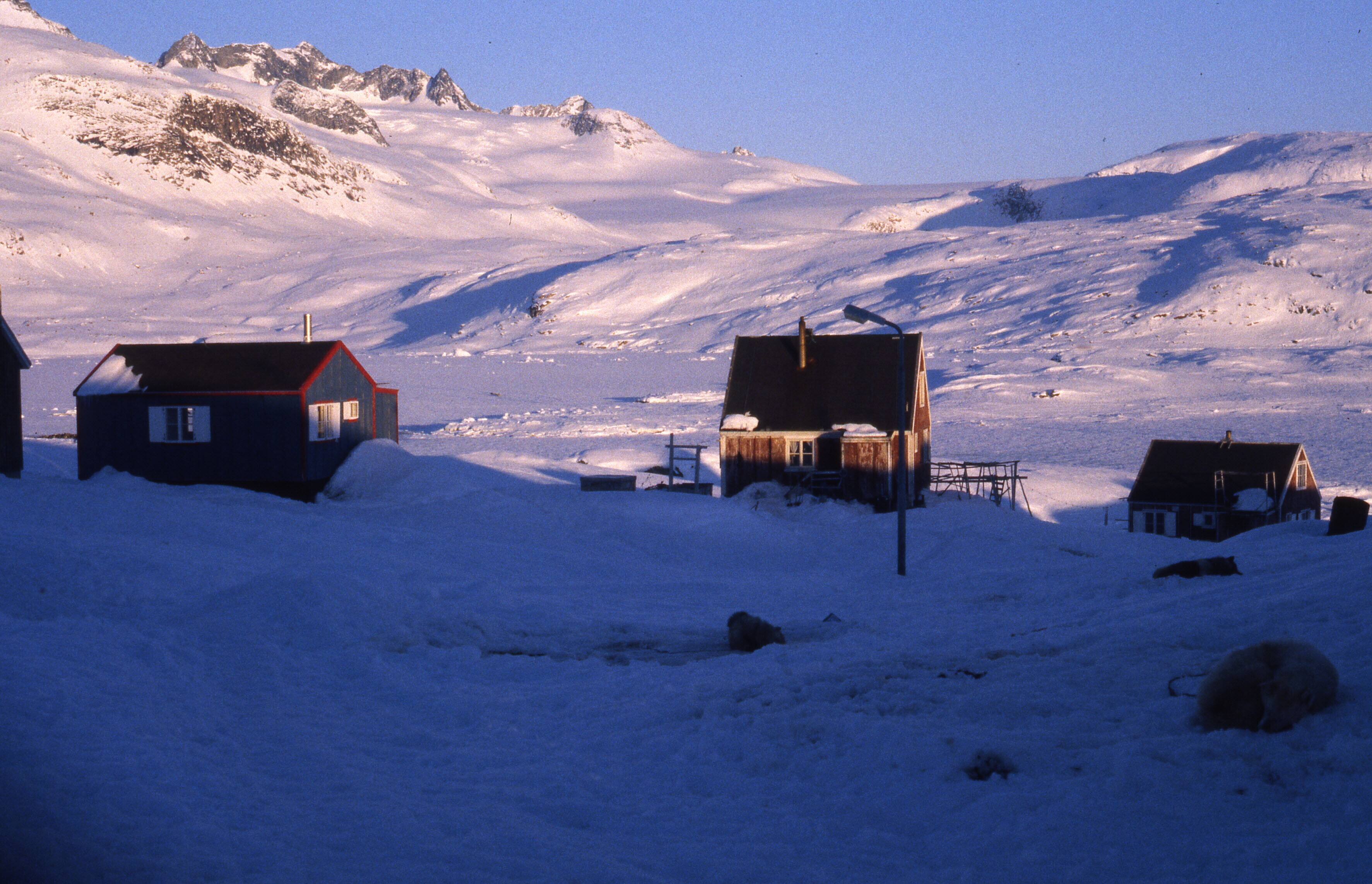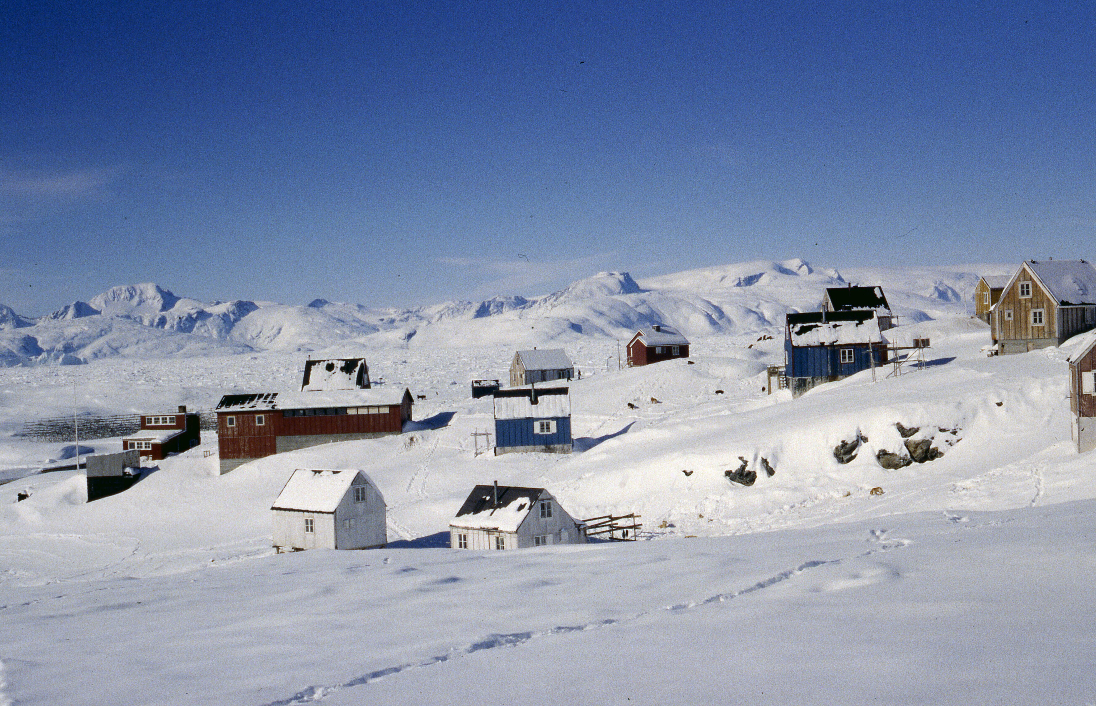 Huizen van Tniteqilaaq in de sneeuw, overdag, maart .