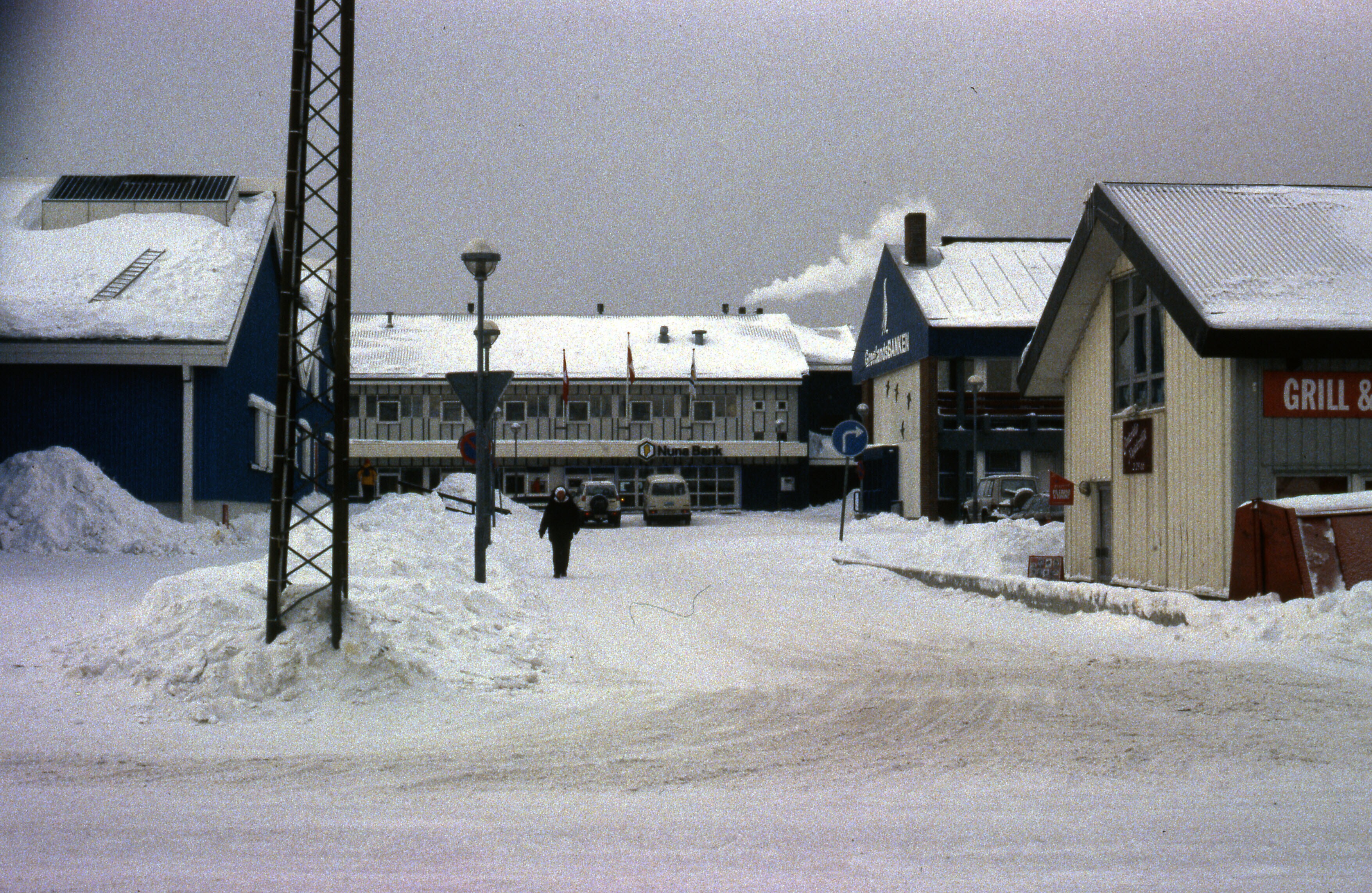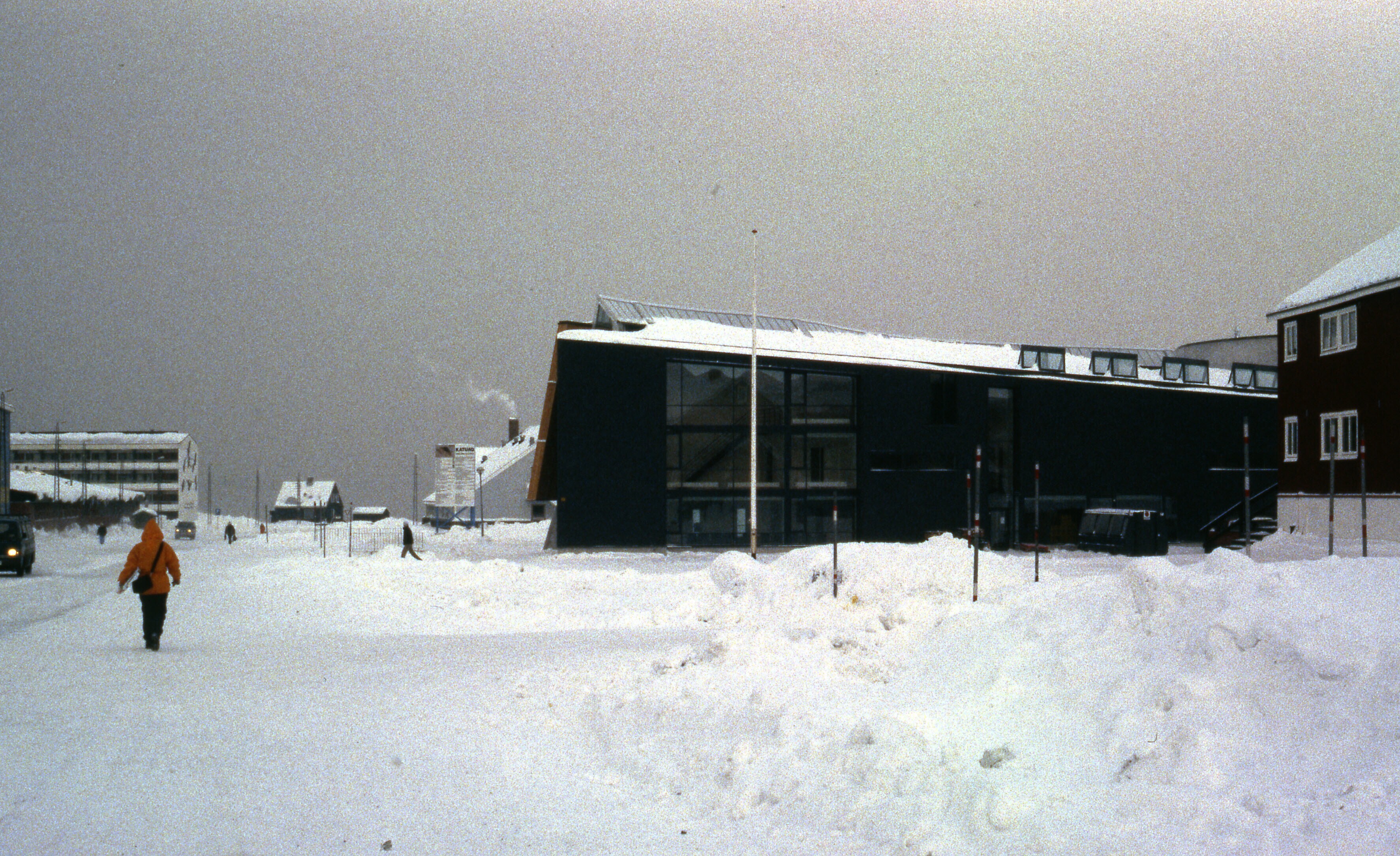 Besneeuwd straatbeeld van Nuuk, maart . Moderne gebo...