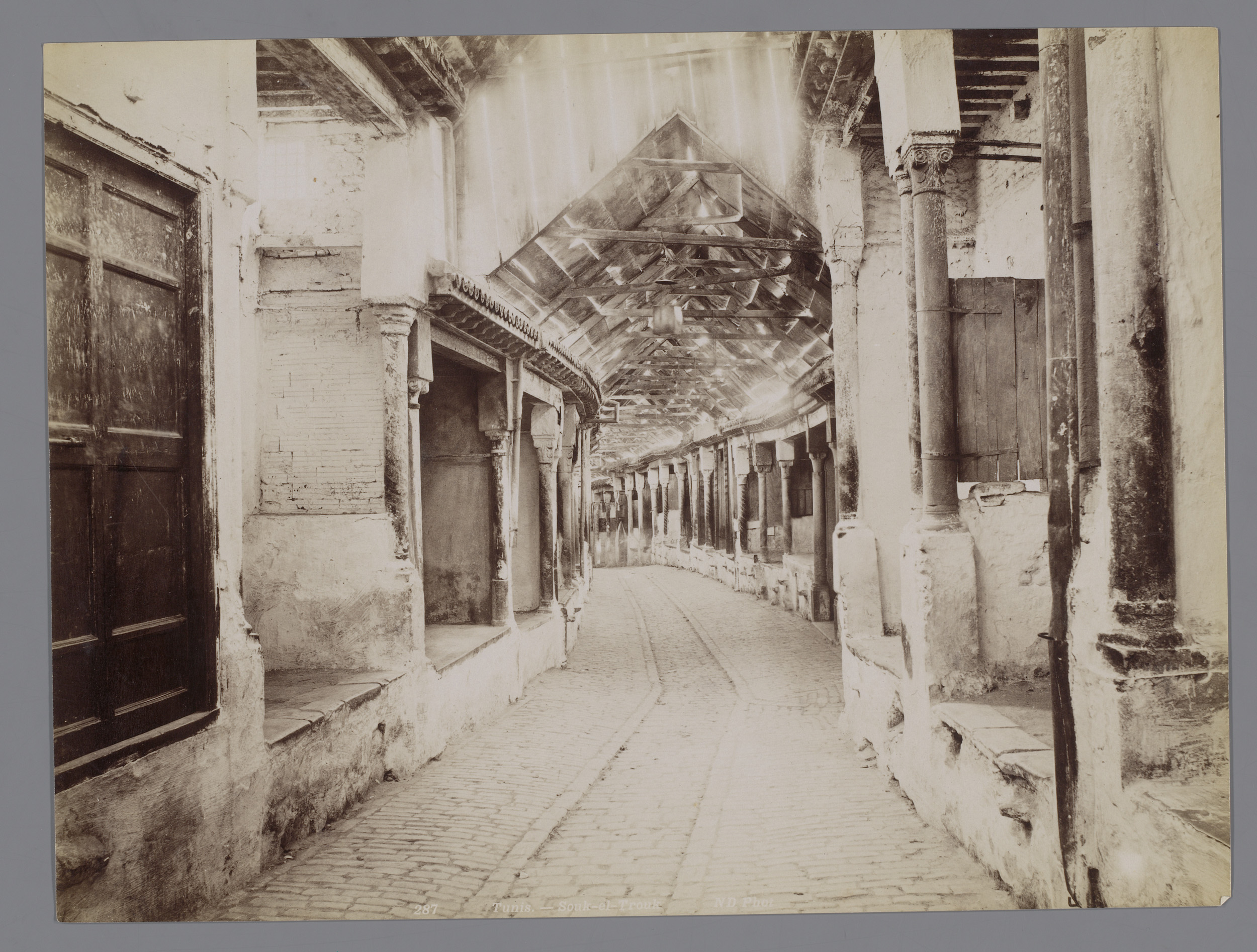 Gezicht op een winkel met mashrabiyavensters in de A...