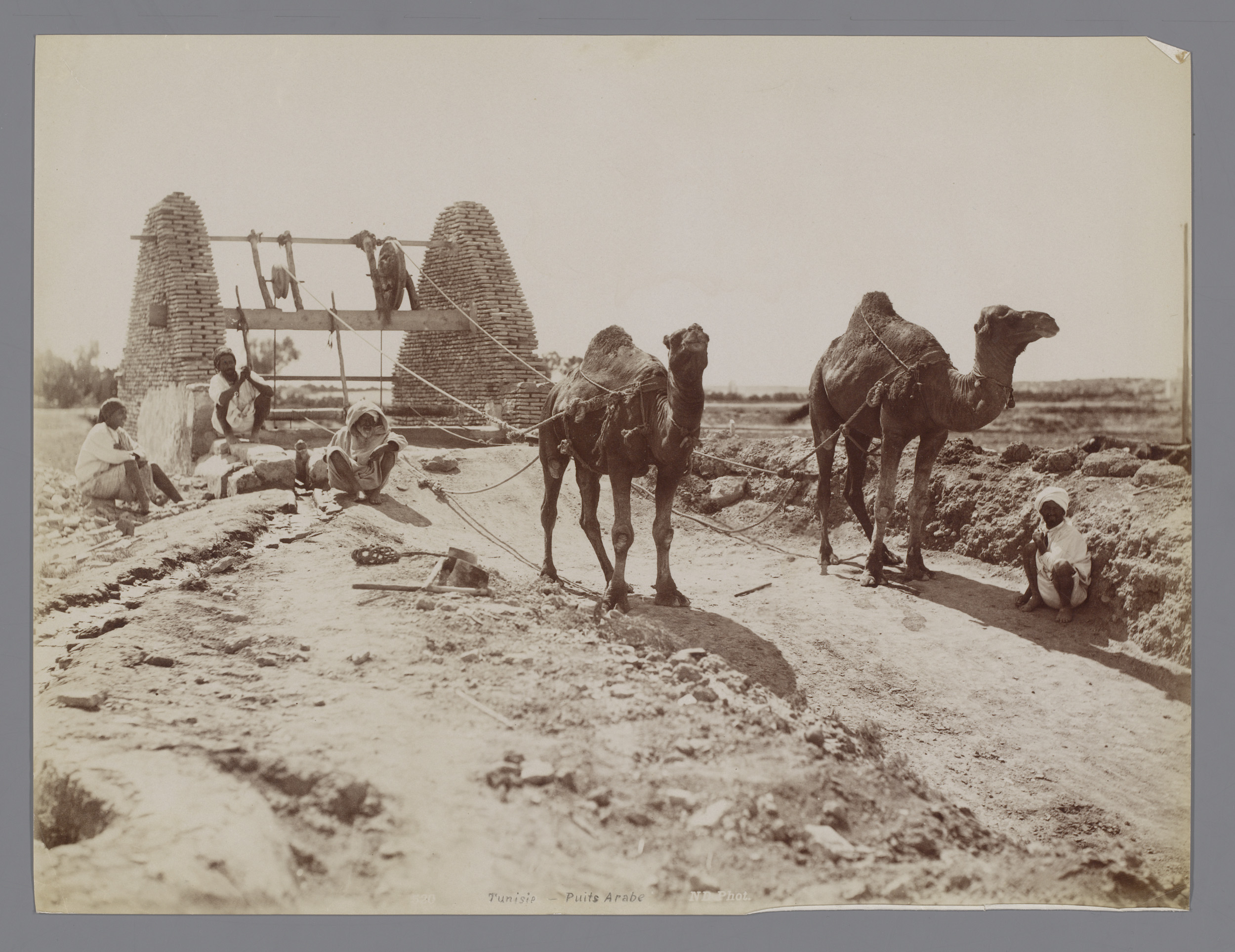 Twee mannen, een kind en een dromedaris bij een wate...