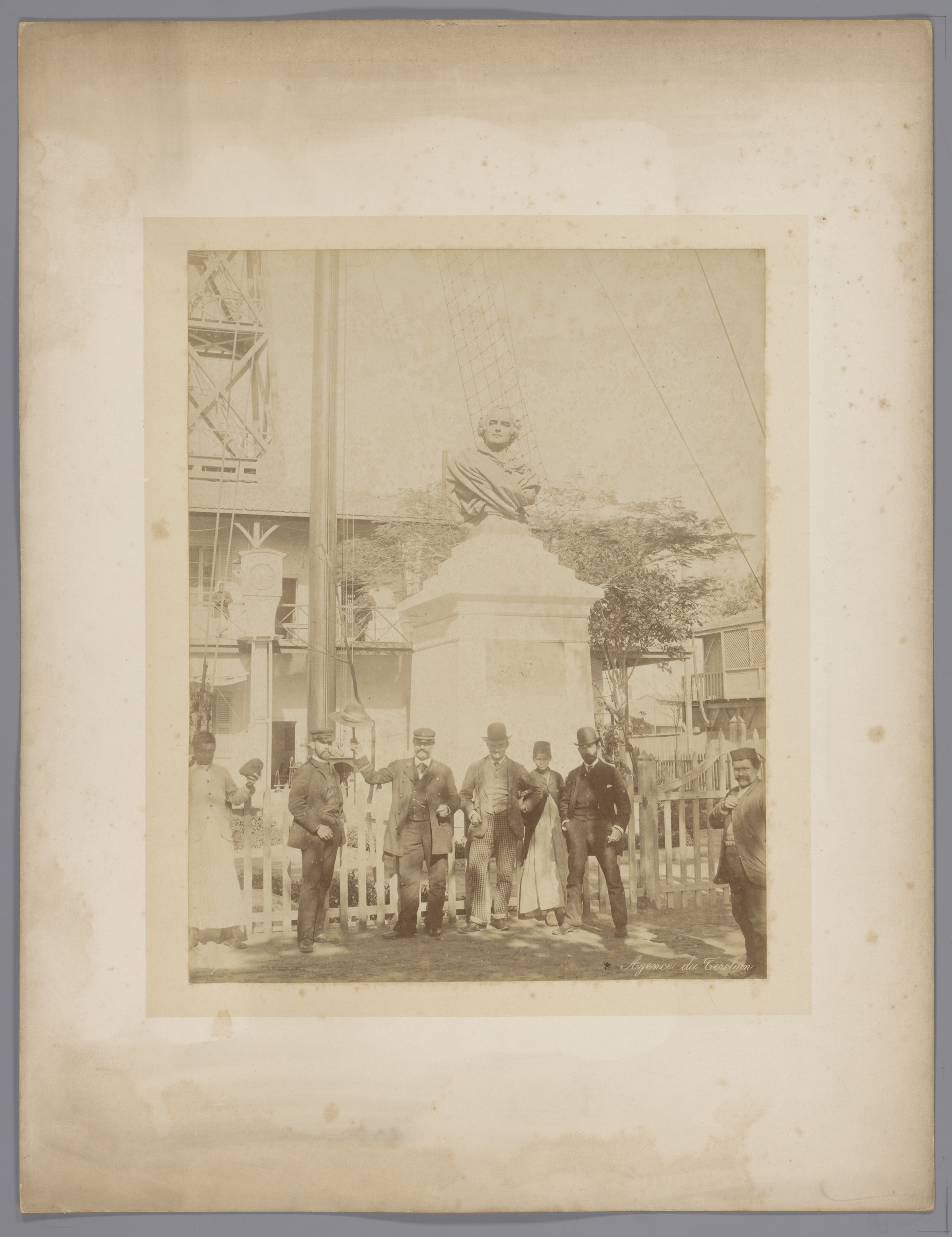 Zes mannen en een vrouw staand voor een monument, ve...