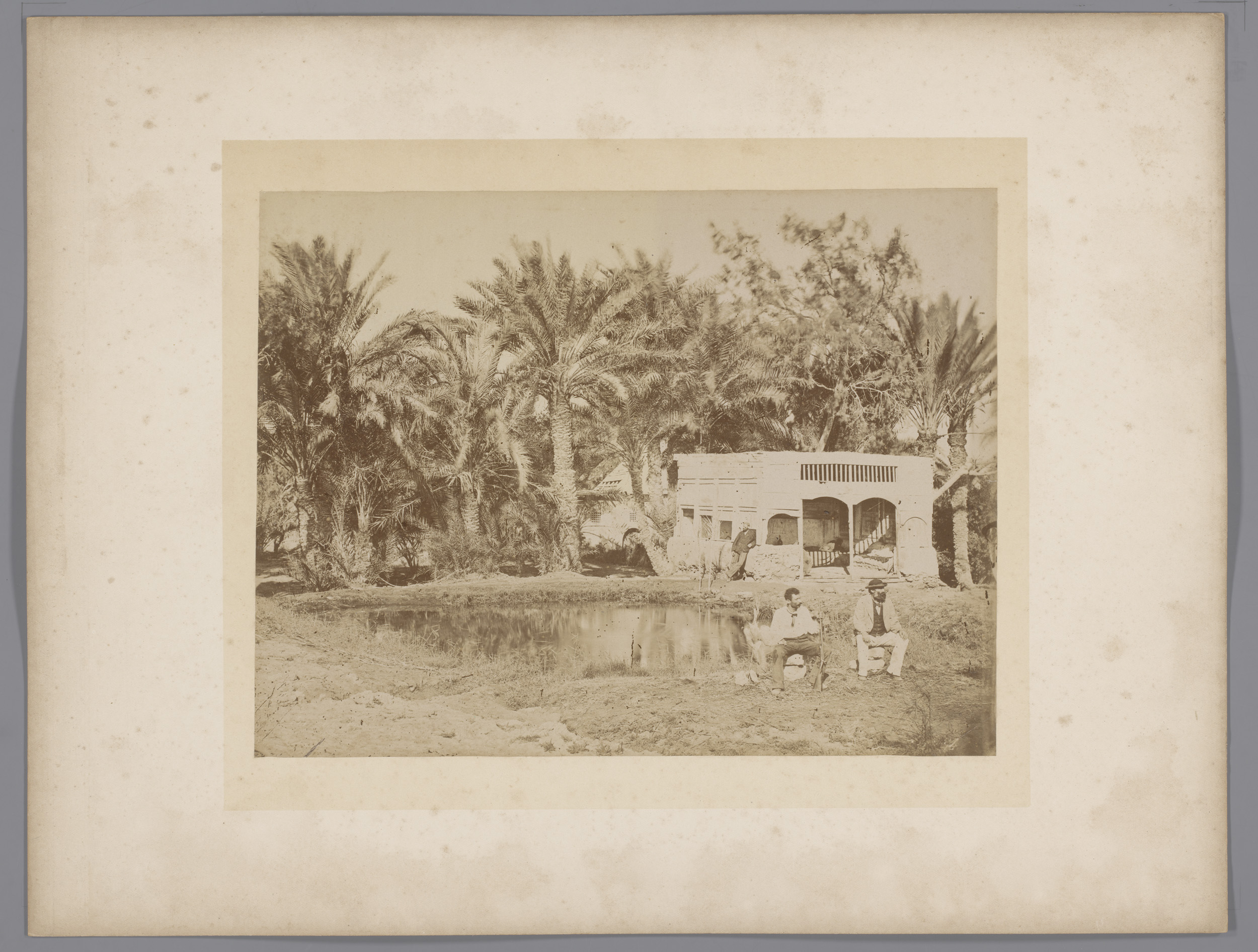 Drie mannen, zittend en staand bij een vijver met da...