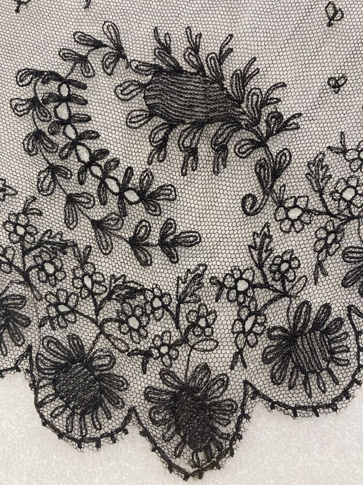 Driekantige doek van zwarte tule, doorgestopt in flo...