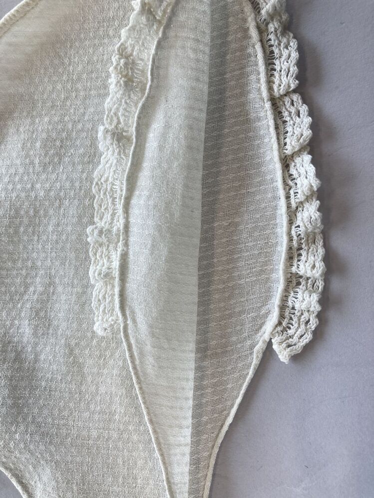 Mutsje van wit katoen, ajour gebreid met tule strook...