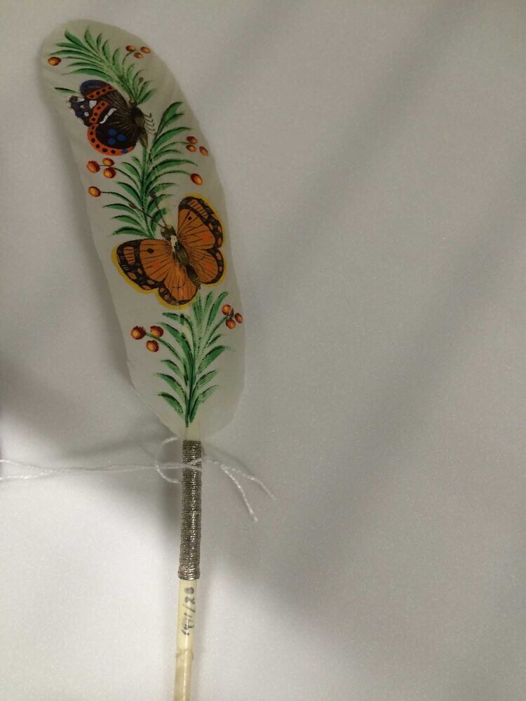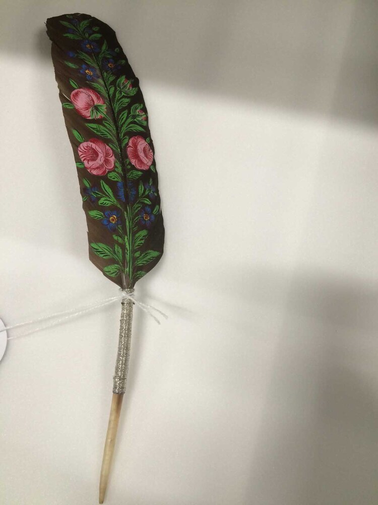 Zwarte beschilderde veer met een bloem, de schacht o...