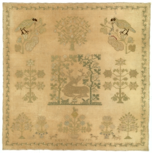Merklap met liggend hert in een tuin en papegaaien, ...