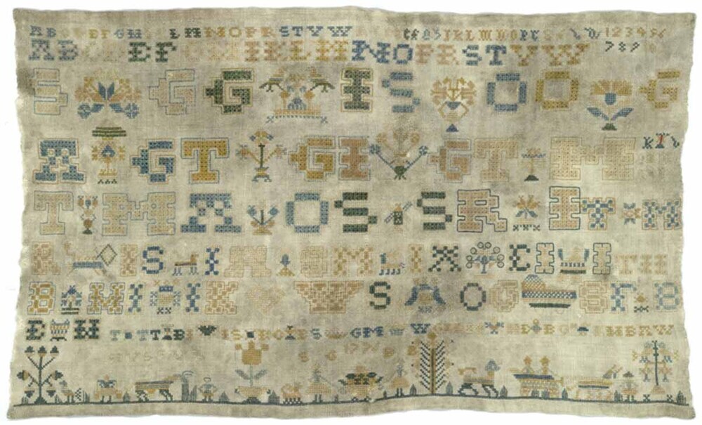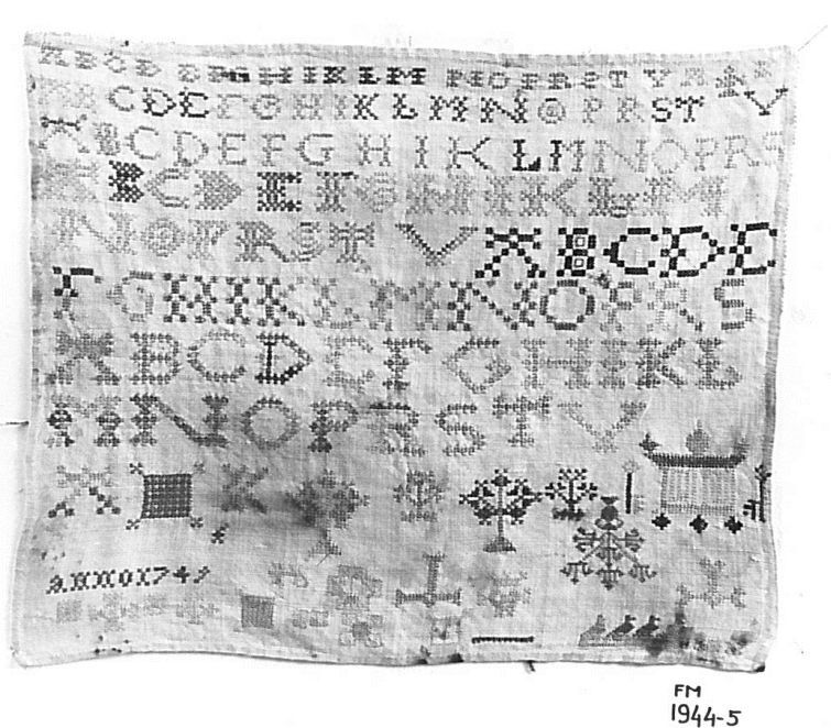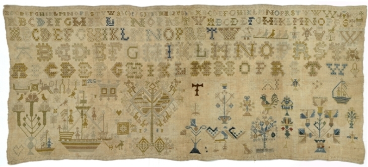 Merklap met schip en initialen, gemerkt A.R. 1853