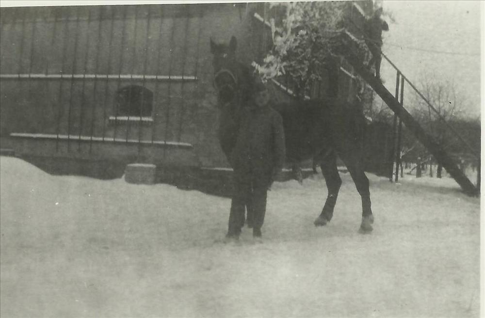 nederlandse militair met paard in de sneeuw bij boer...