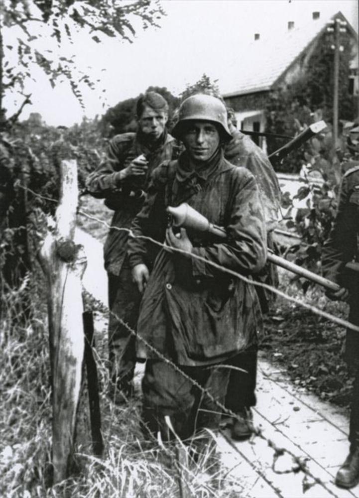 3 Duitse militairen in Luftwaffe smock; Faustpatrone