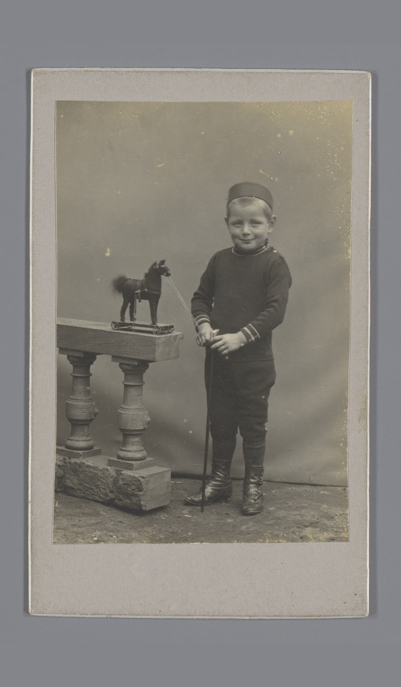 Portret van Gerrit Looman met een speelgoedpaard