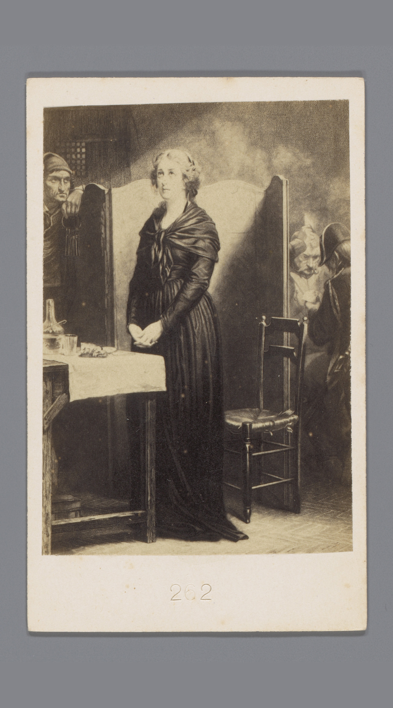 Fotoreproductie van een prent van een biddende vrouw