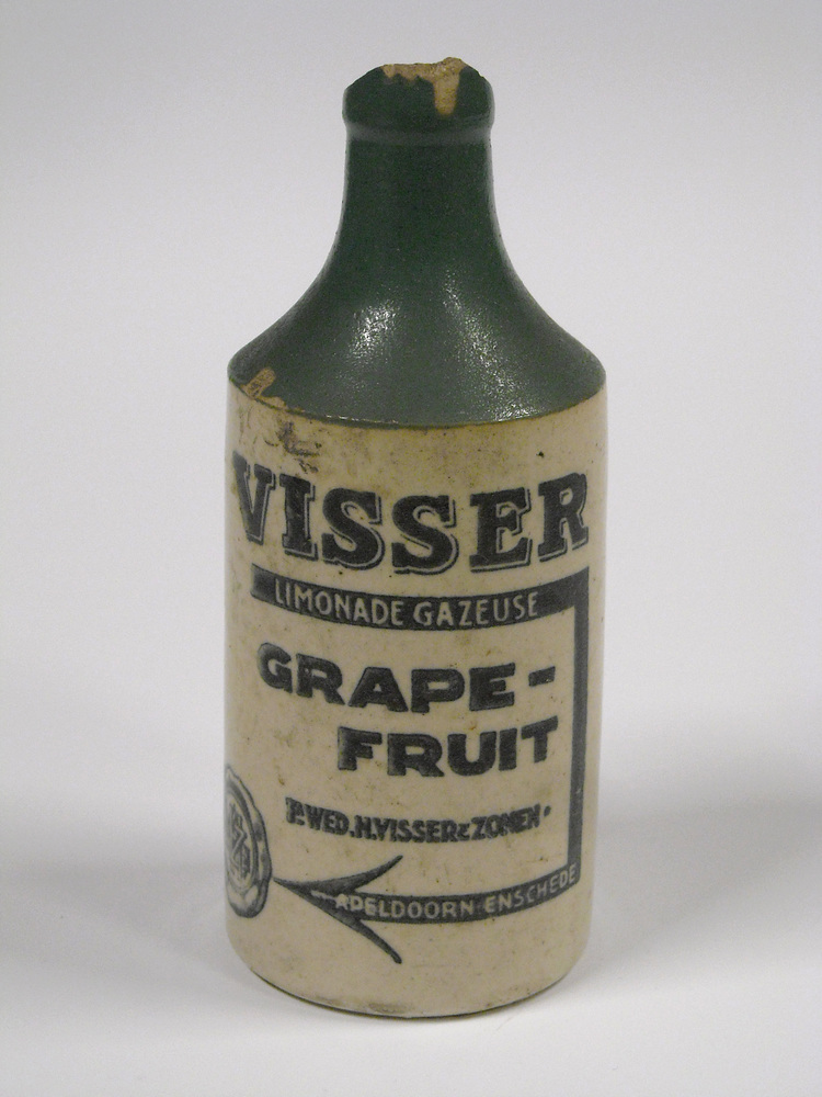 Frisdrankkruik met opschrift: Visser limonade gazeus...