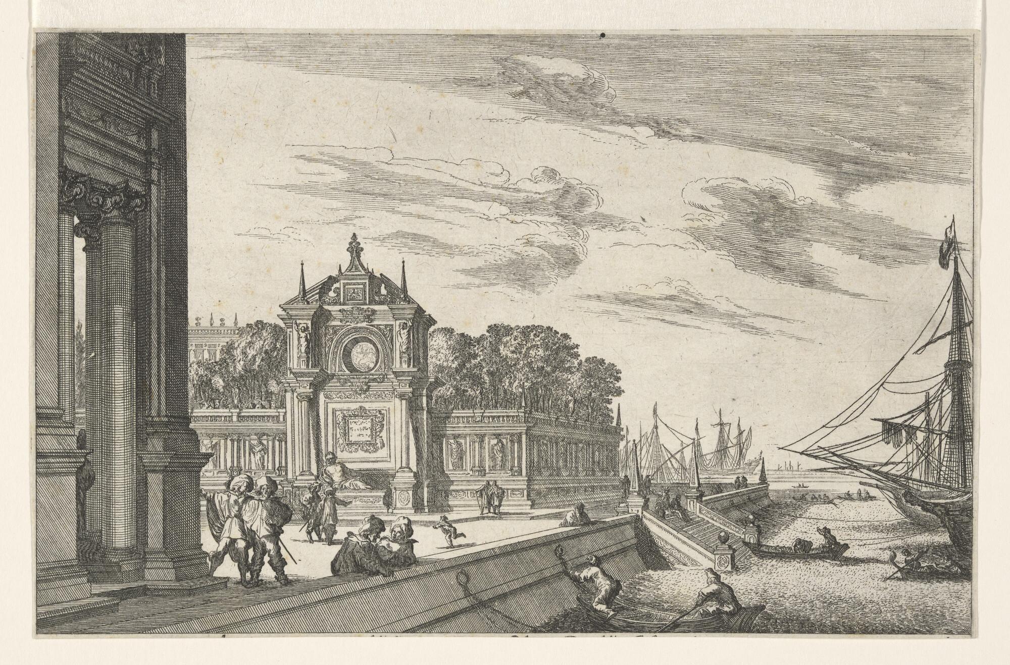 Prent uit een reeks van 12 van zeehavens en paleizen...