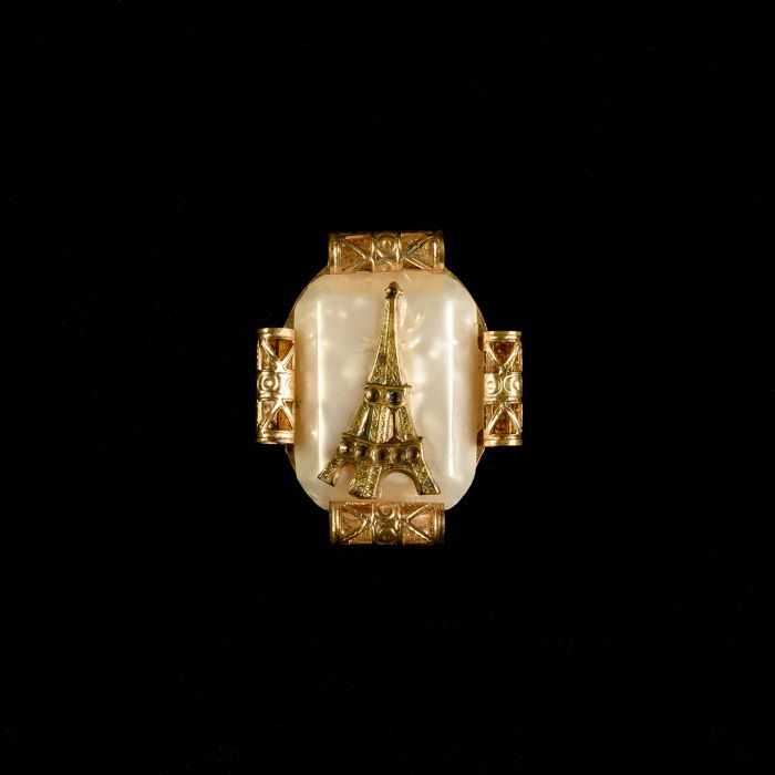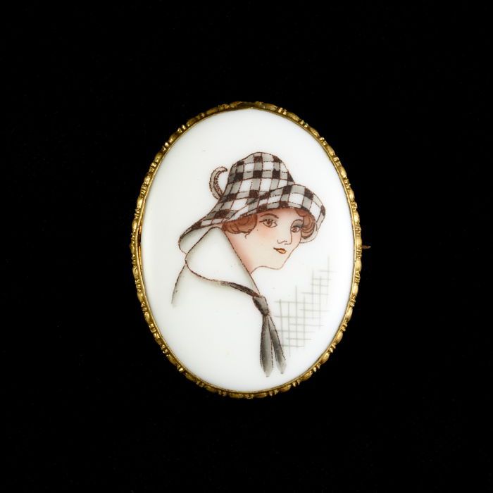 Broche, ovale wit kunststof steen, dame met hoed