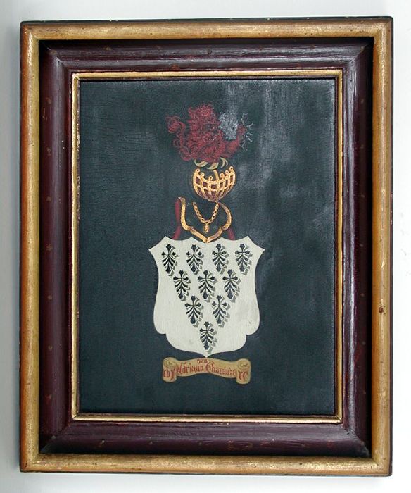 Familiewapen met naam van Adriaan van Charante in ba...