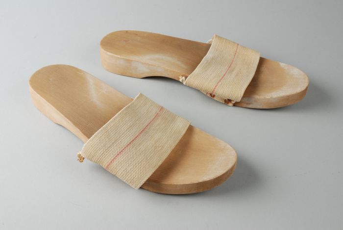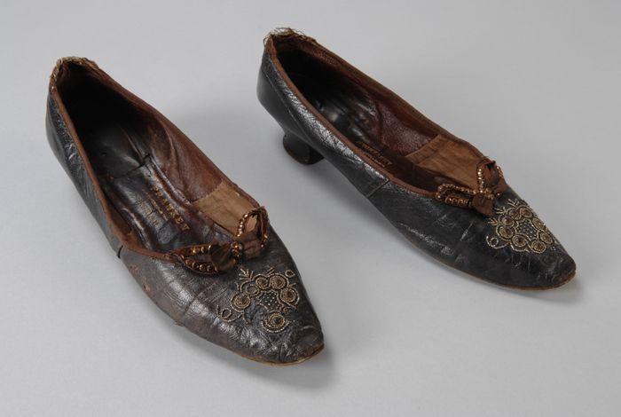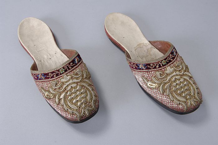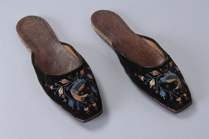 Leren slippers met zwart fluweel waarop een geborduu...