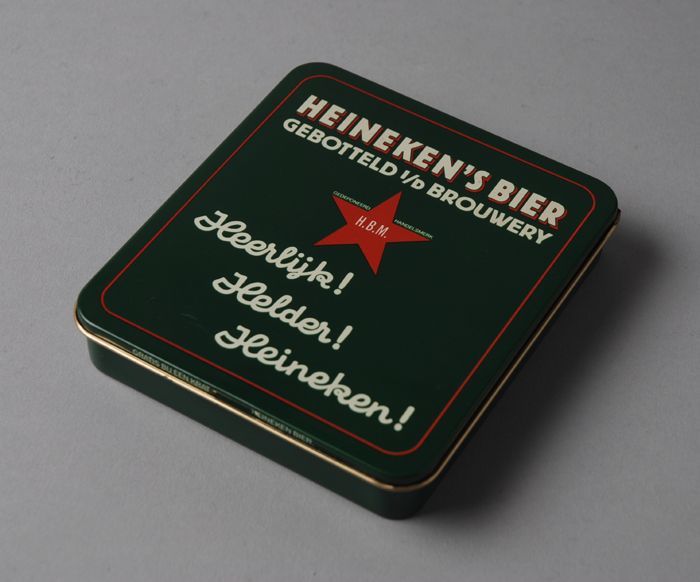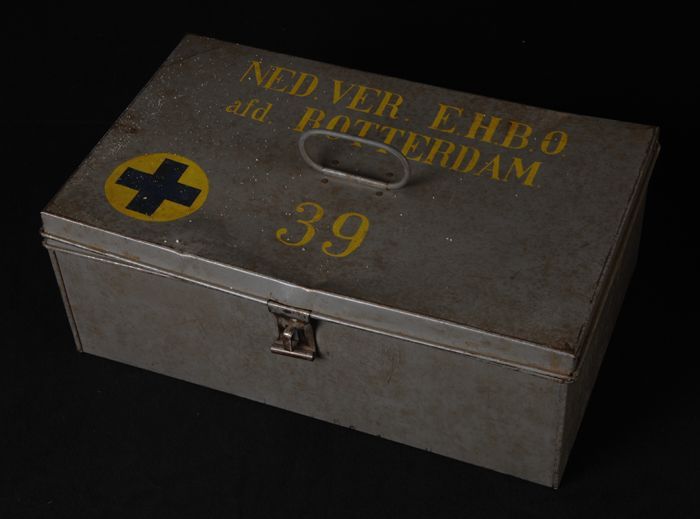 Metalen kist met in geel "Ned. Ver. E.H.B.O. / Afd. ...