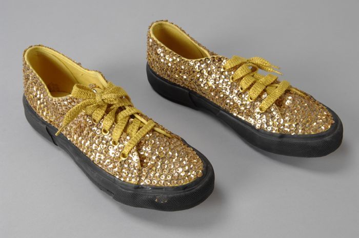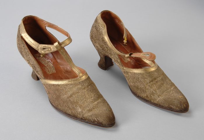 Gouden damesschoenen van goudbrokaat en goudleren T-...