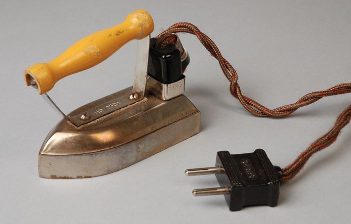 Reisstrijkijzer met houten handvat, bruin snoer en z...