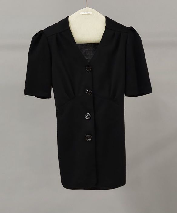Broche, zwart strikje van fluweel met twee aanhangen...
