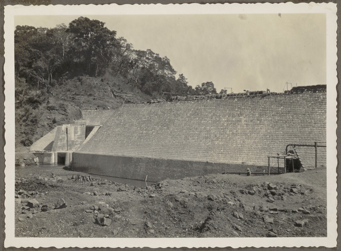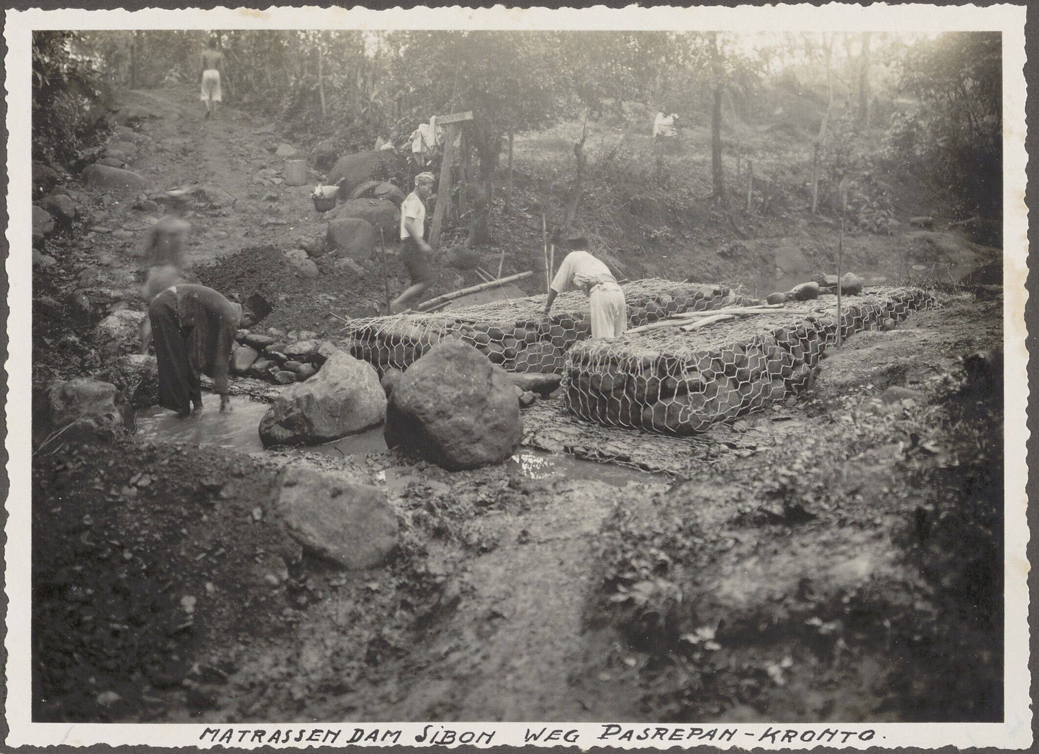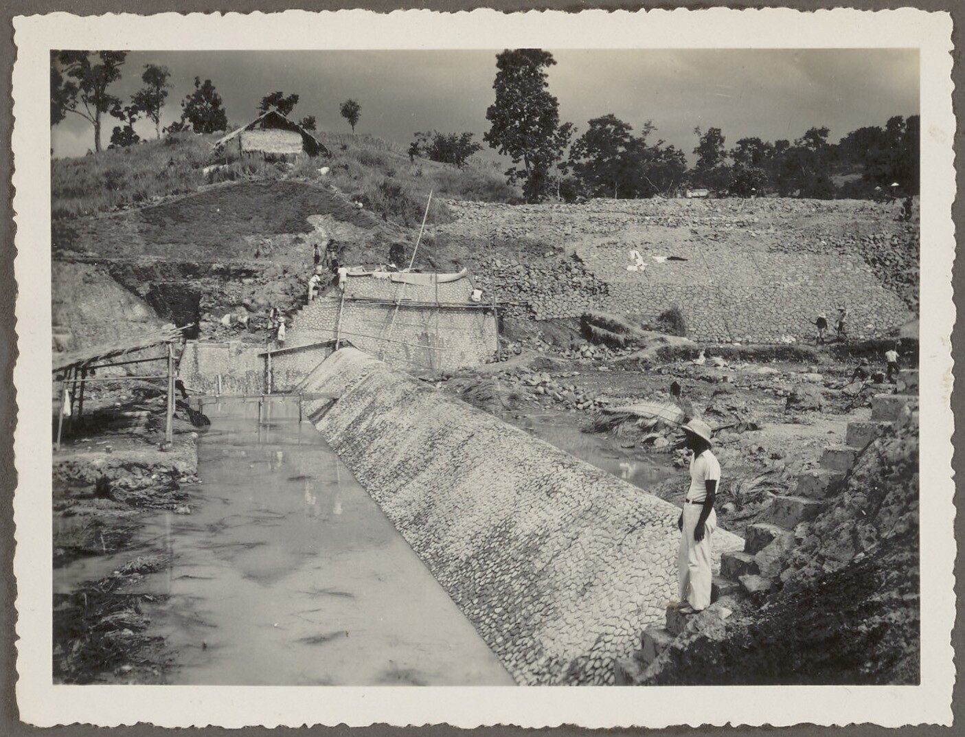 De Javaanse arbeiders werken aan een stuwdam in de r...