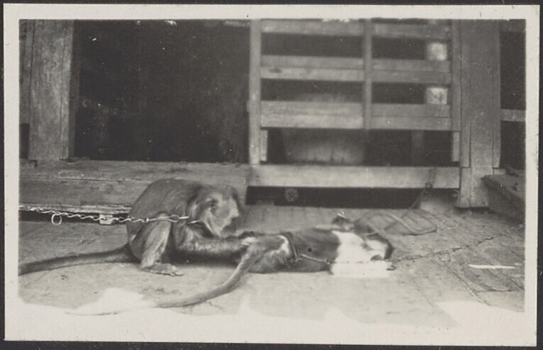 Aapje aan de ketting bij de stal