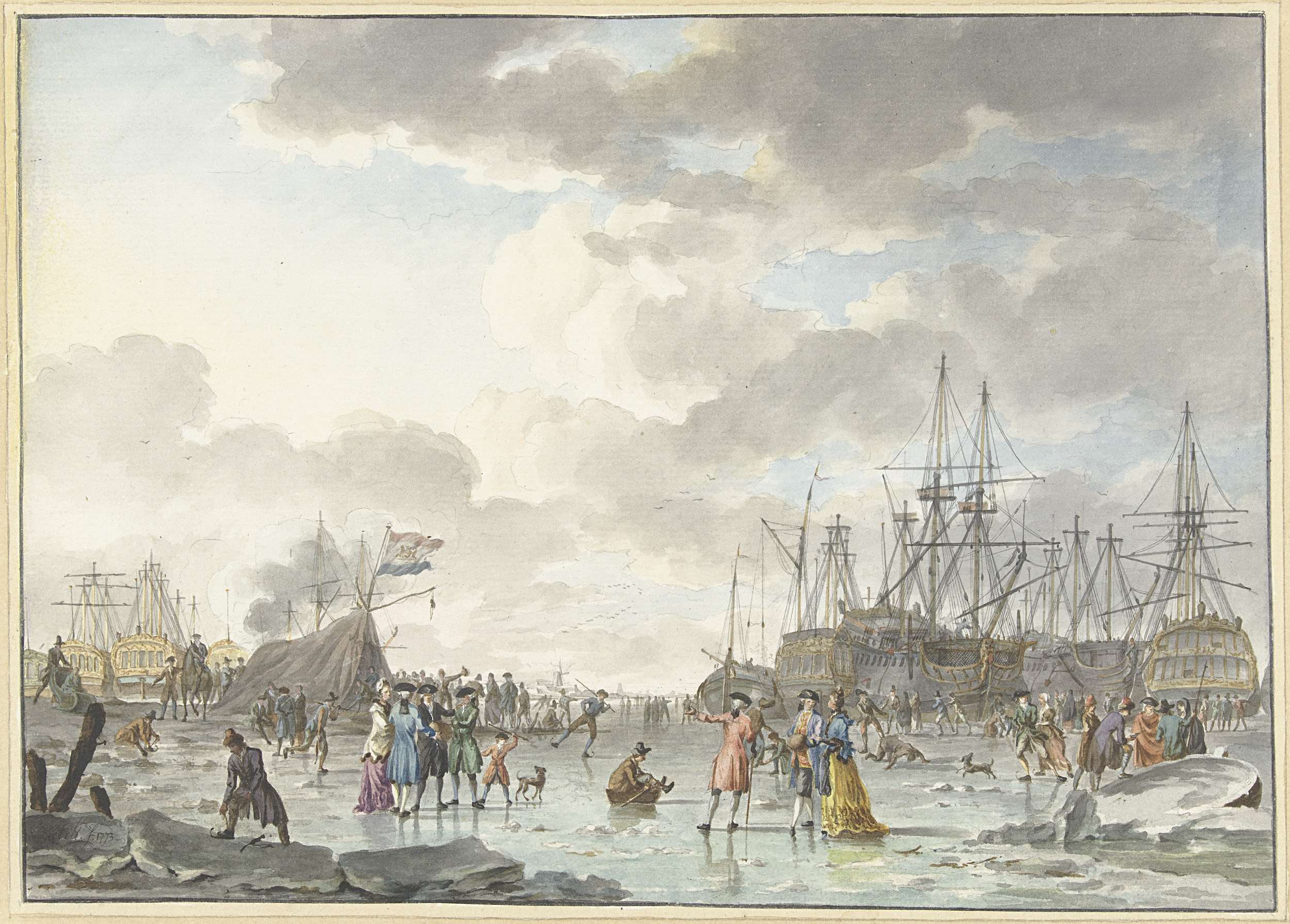 IJsvermaak op een bevroren rivier met schepen