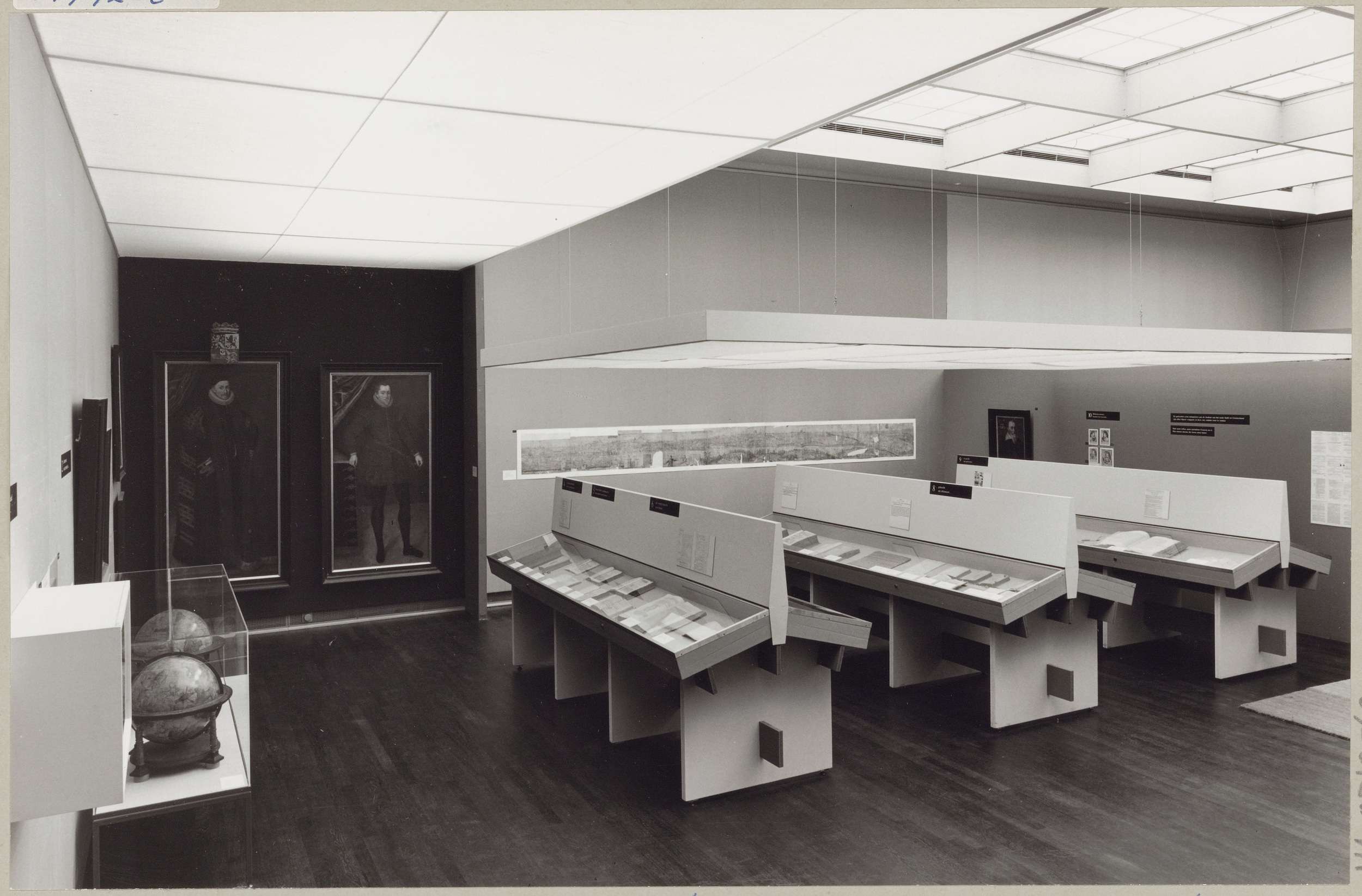 Zaal met diverse objecten waaronder boeken in vitrin...