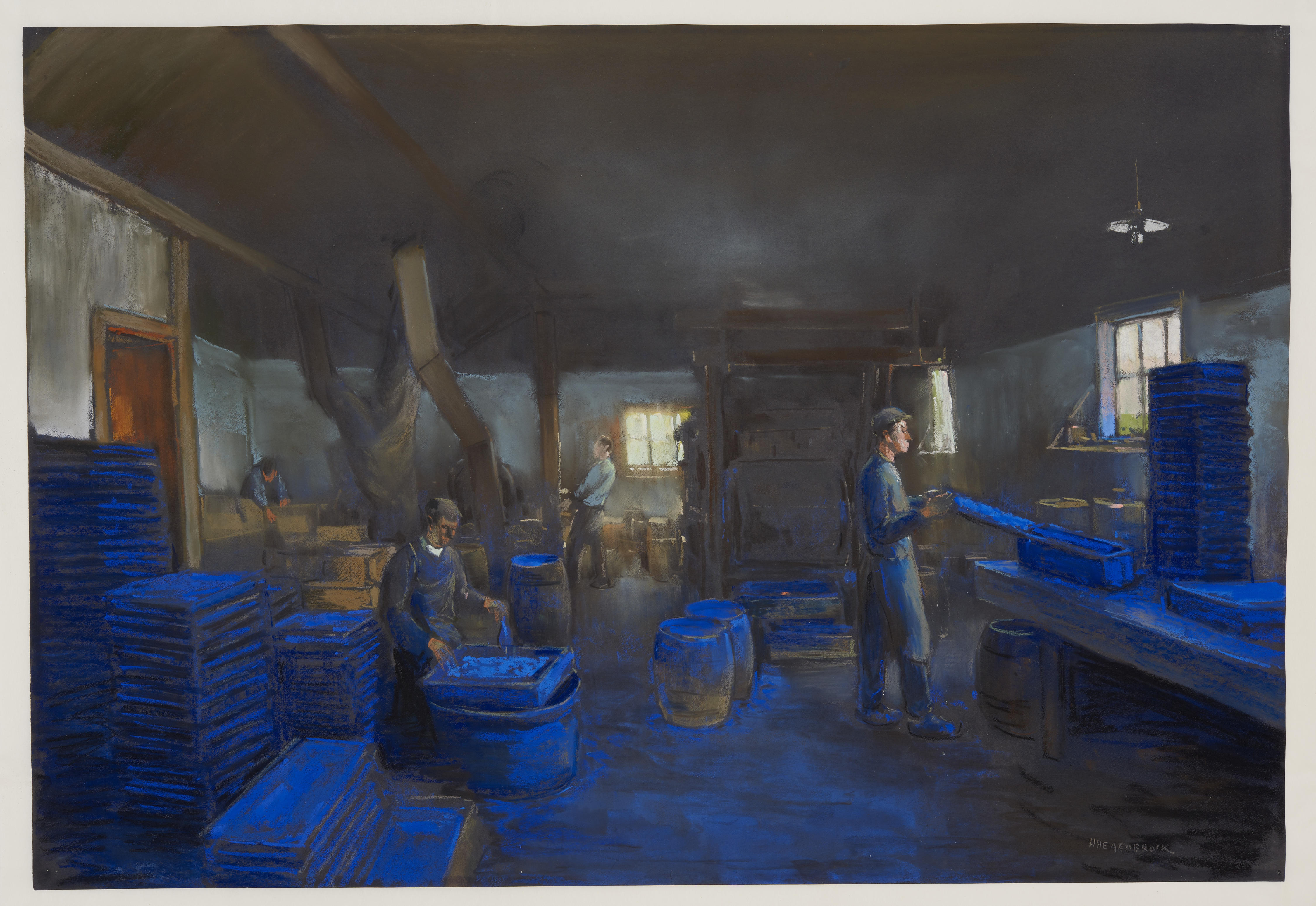 Interieur van een blauwselfabriek in Westzaan, circa...