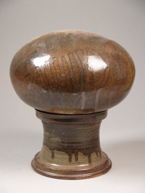 Pot, bol, met bolle deksel met reliëfdecor van drieh...