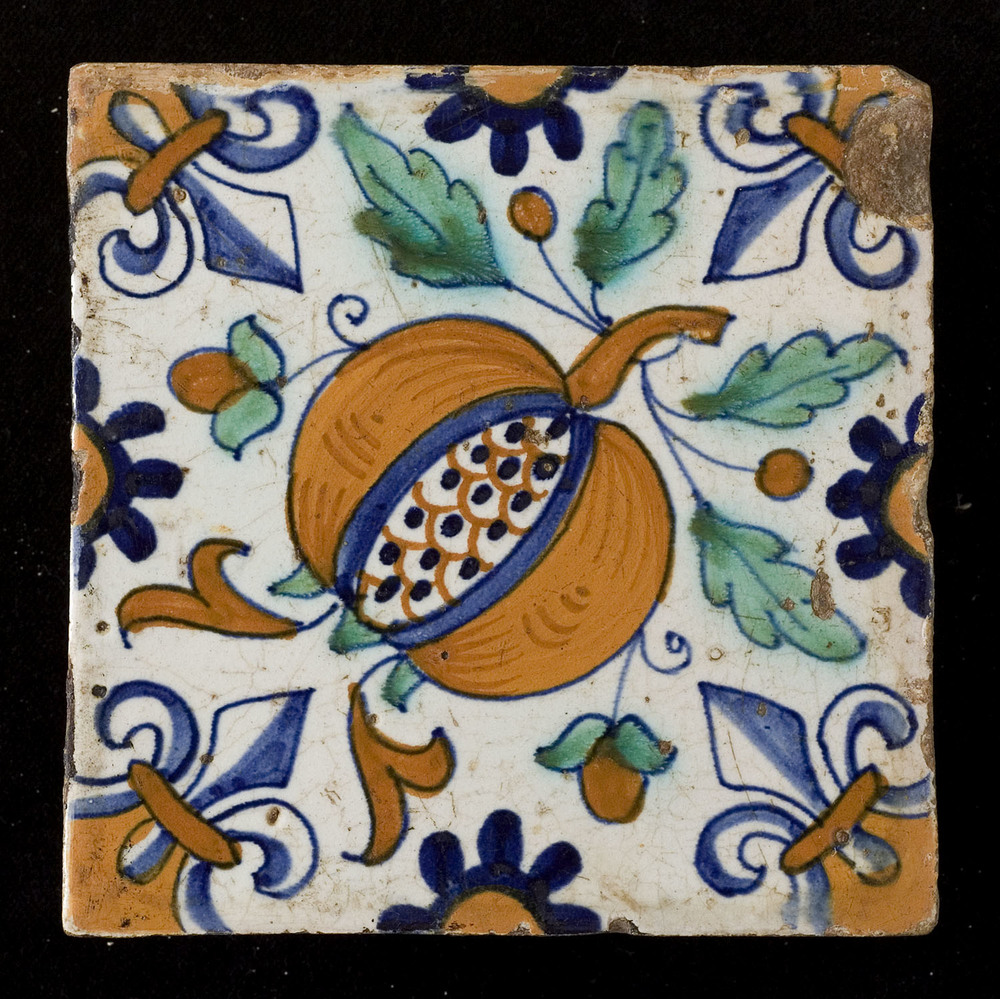 Tegel van keramiek met tinglazuur, voorstellende: or...