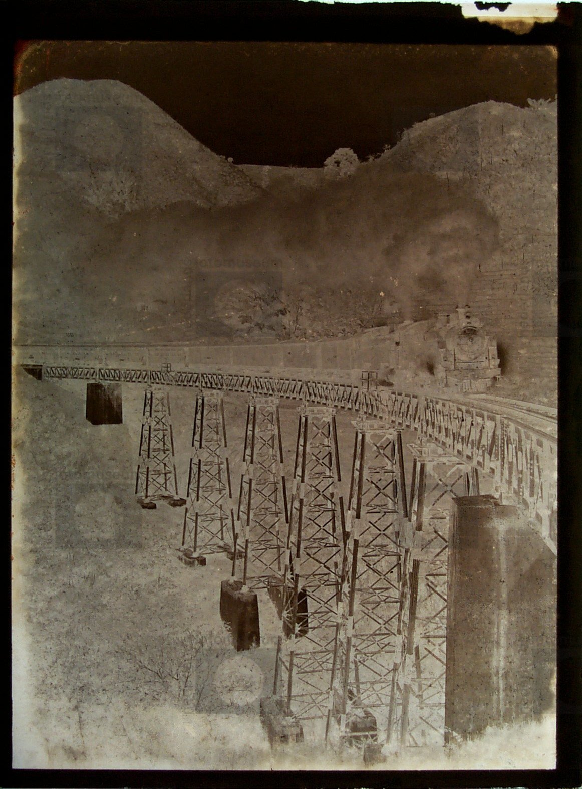 Stoomtrein op viaduct, Java, Indonesië (1919-1930)